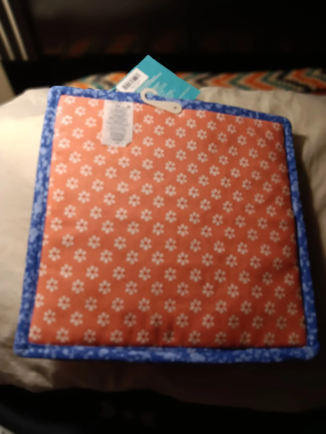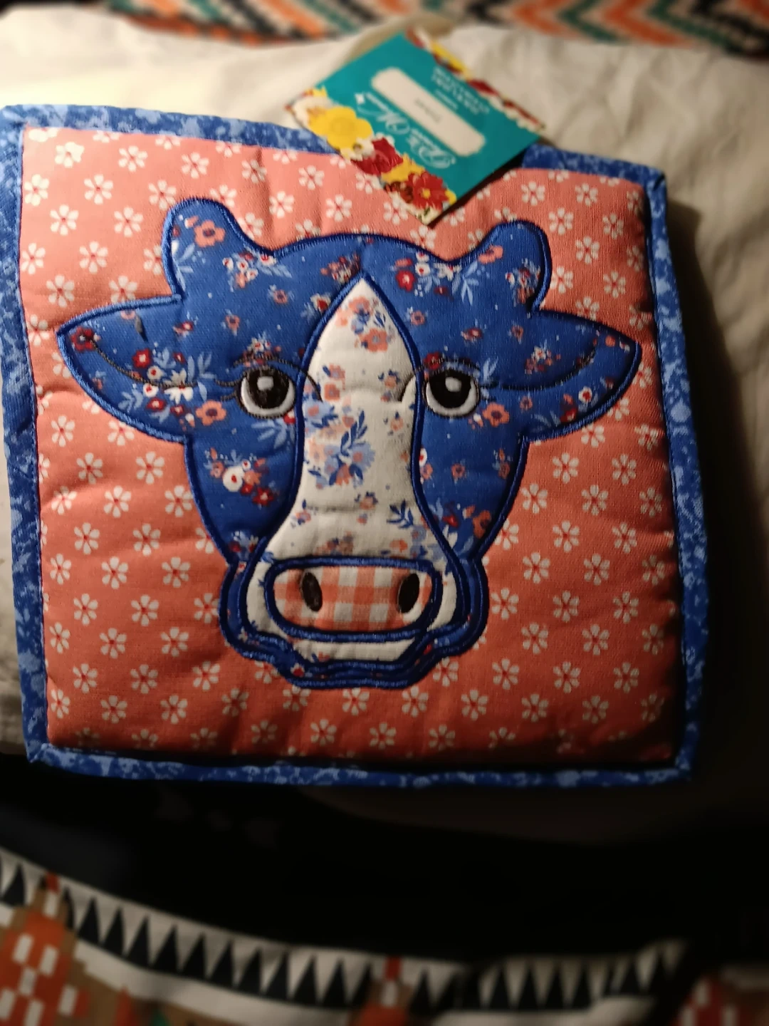 This pot holder features a fun cow face design on a coral background with a blue floral border. It's made from quilted fabric. Perfect for protecting your hands in the kitchen!