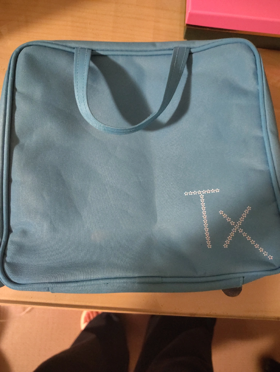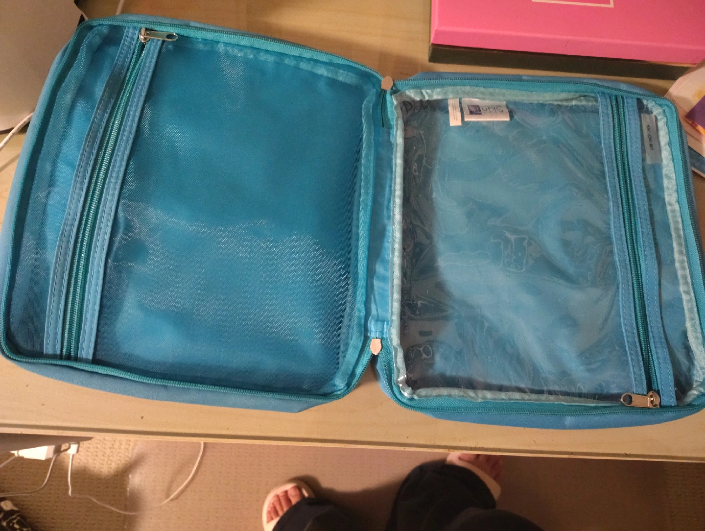 Here's a light blue travel case with a handle, perfect for keeping your items organized on the go! It has a zipper closure and a clear compartment inside. Mint condition and haven't used it a lot.