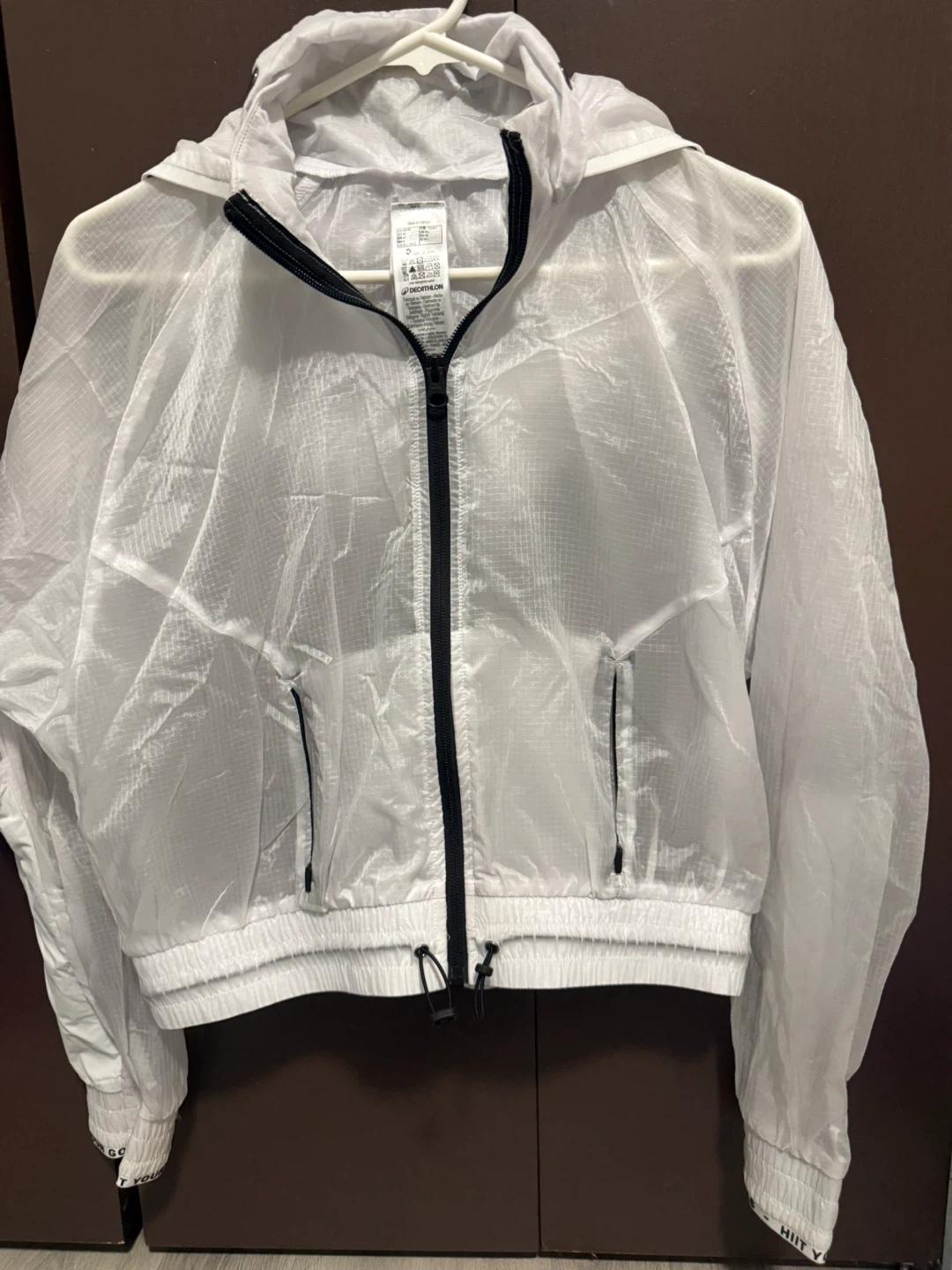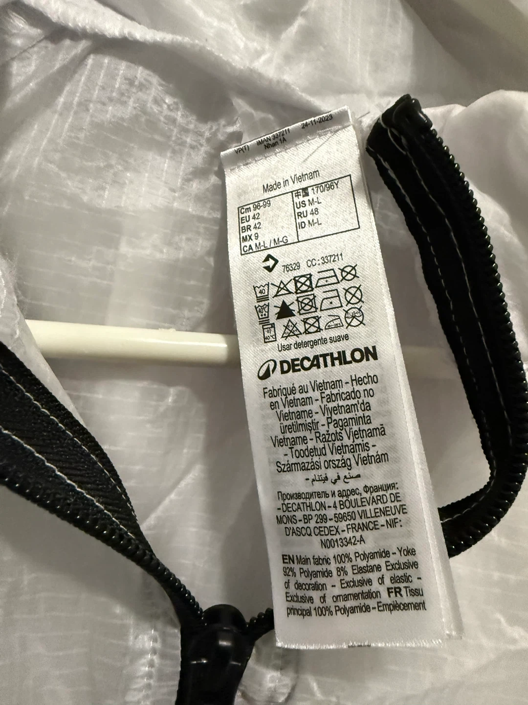 Giving away a lightweight, white windbreaker jacket from Decathlon. It's a size M and made of 100% polyamide main fabric and 92% polyamide, 8% elastane for the yoke. Perfect for outdoor activities!