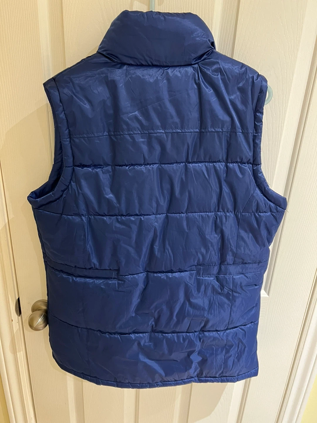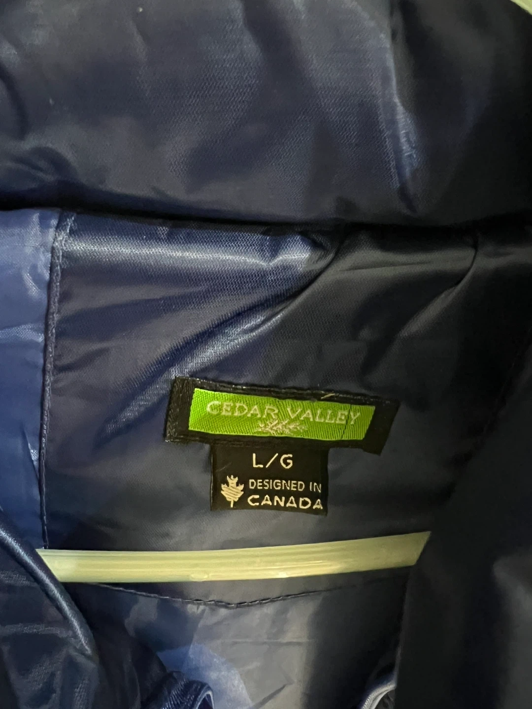 This is a navy blue puffer vest from Cedar Valley. It's designed in Canada and made for a size large. It's great for layering on cooler days!
