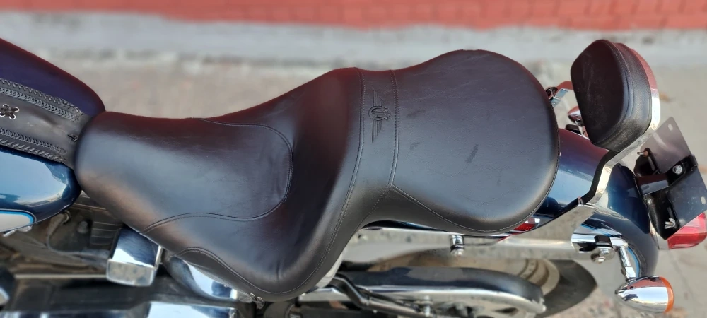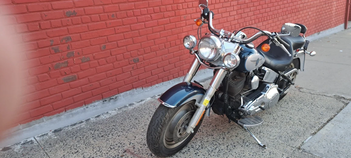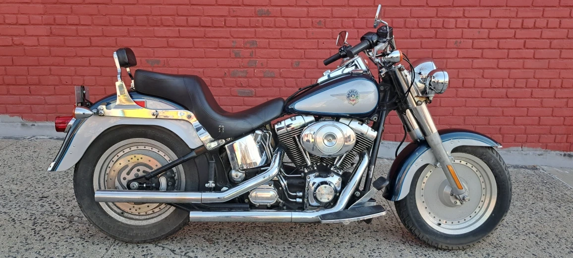 Classic Harley Davidson motorcycle with a chrome exhaust and comfortable seat. It features a V-twin engine and a distinctive blue and silver paint scheme. This bike is ready for the road!