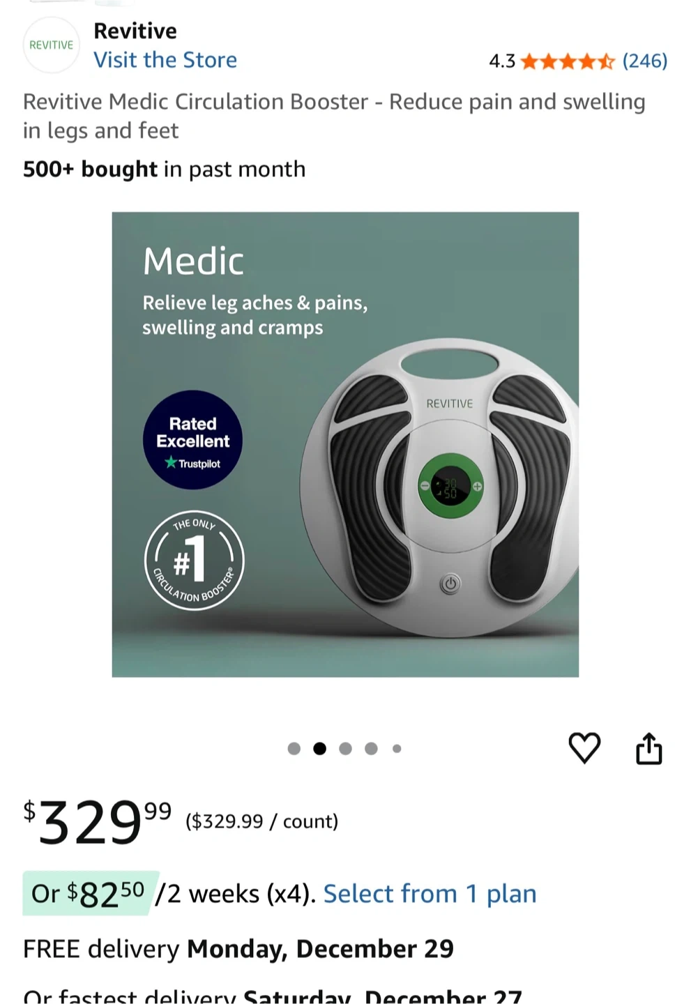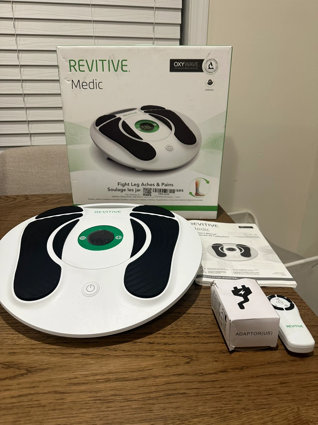Selling a Revitive Medic Circulation Booster in great condition! It comes with the box, user manual, adaptor, and remote control. This device is designed to help fight leg aches and pains, and improve circulation. Perfect for anyone looking for a little extra relief!