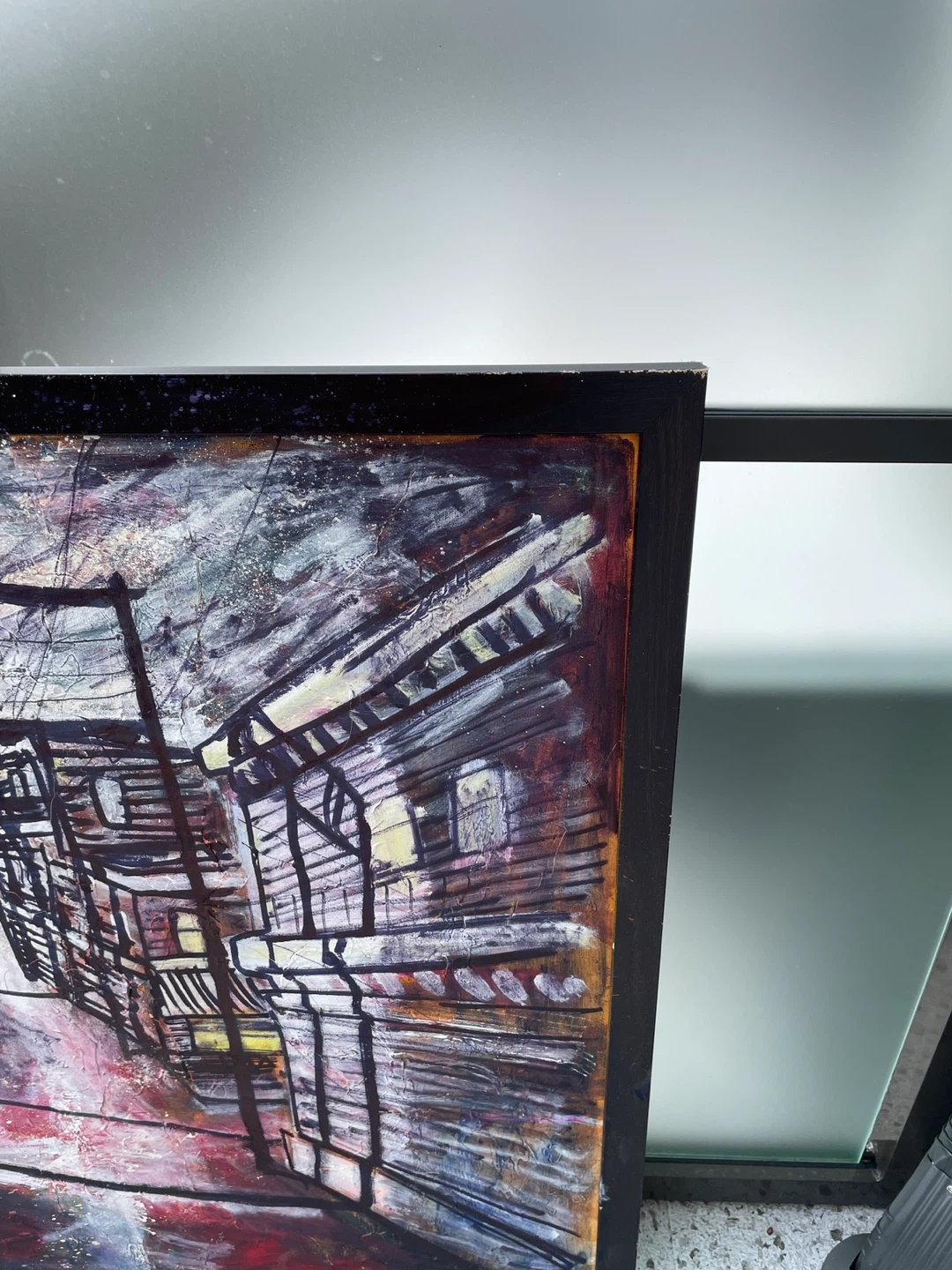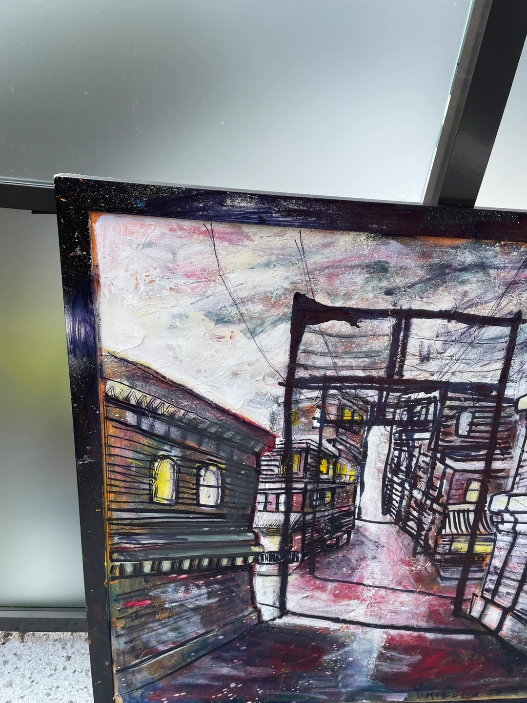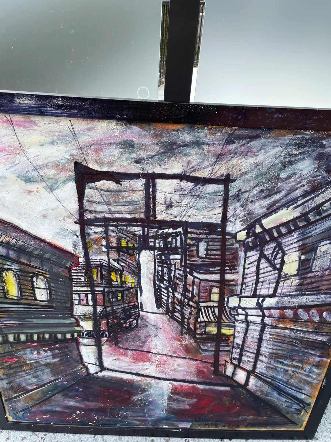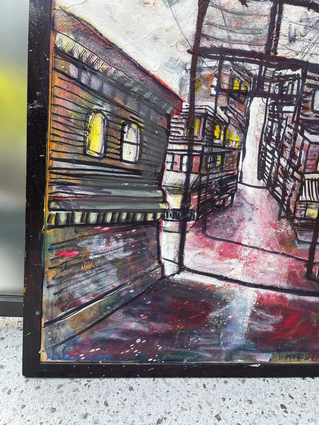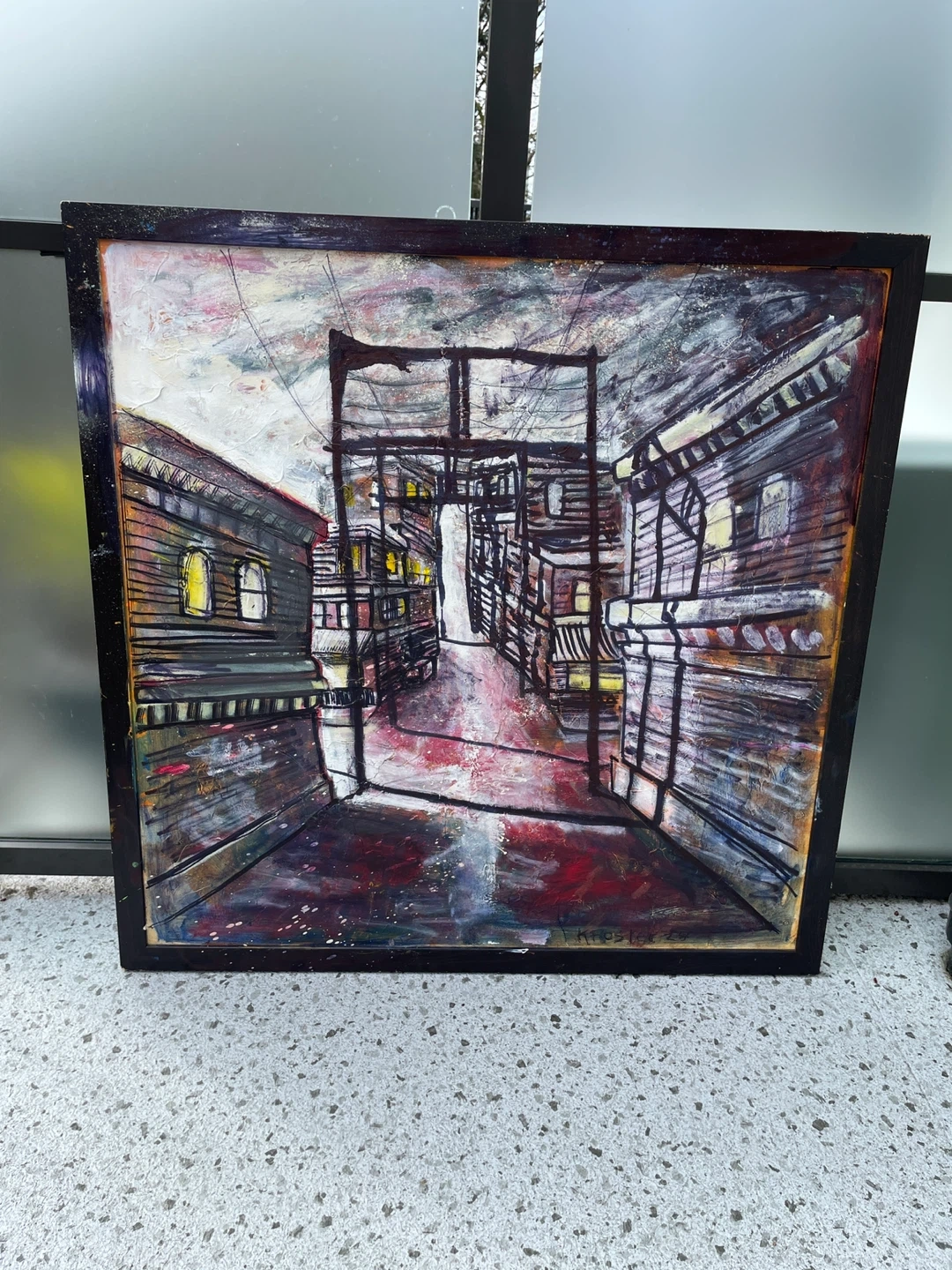 Original Ken Foster painting featuring a moody urban alley scene with strong depth and perspective. The composition pulls the viewer into a rain-soaked back lane framed by industrial buildings, overhead wiring, and glowing interior windows that add warmth against a gritty, atmospheric backdrop. Expressive linework combined with layered texture and heavy brushwork creates a cinematic, almost noir-like feel. This is a large-scale statement piece that carries both visual impact and a distinct city narrative.