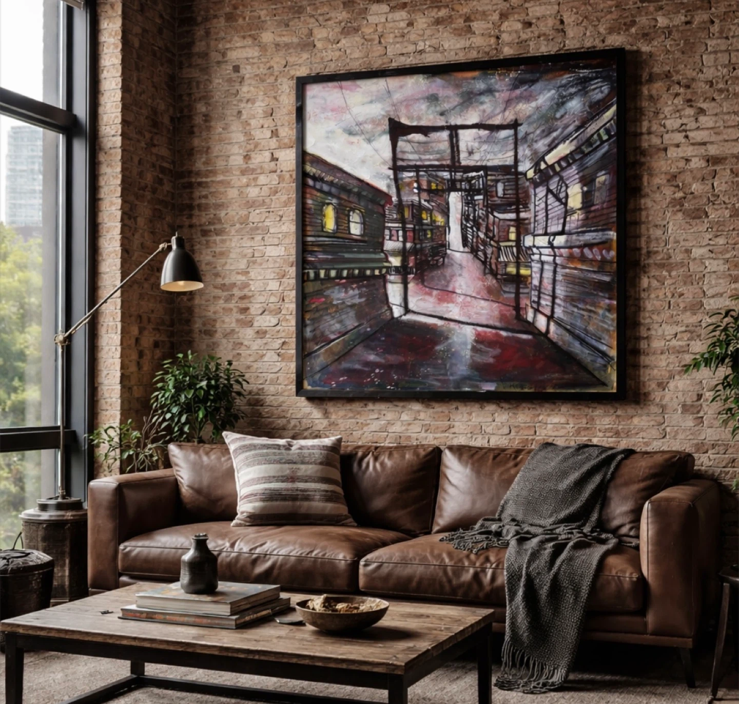 urban wall art, city alley scene, rainy street art, industrial decor, loft wall decor, moody wall piece, noir style art, city night scene, gritty wall art, modern loft art
