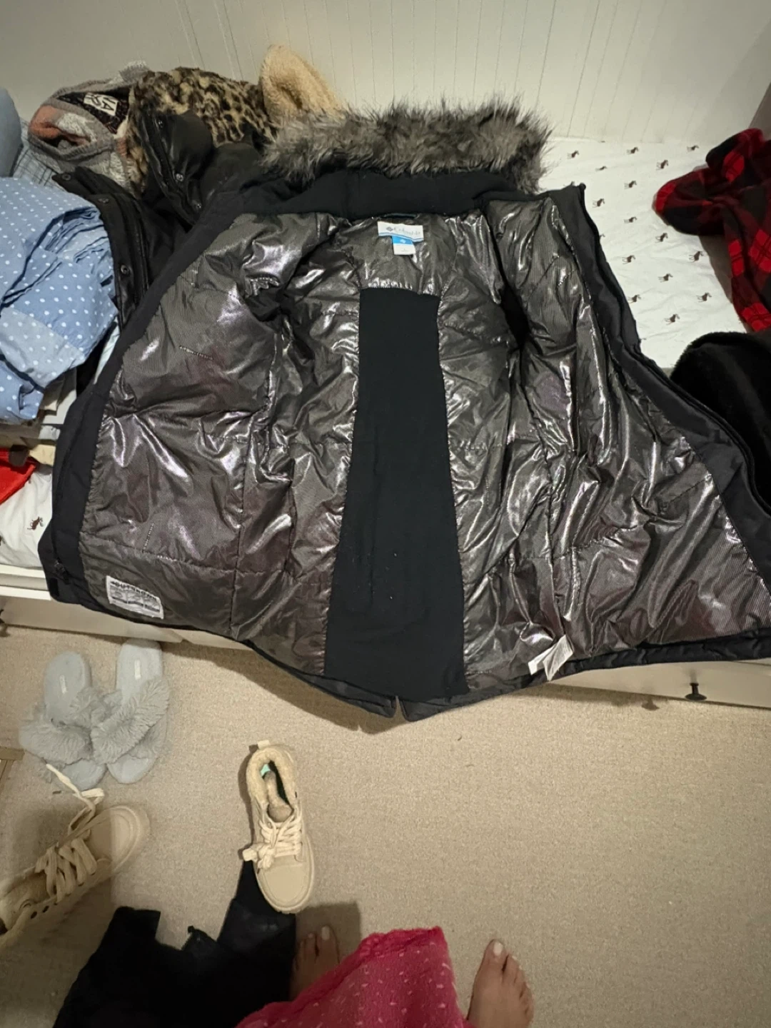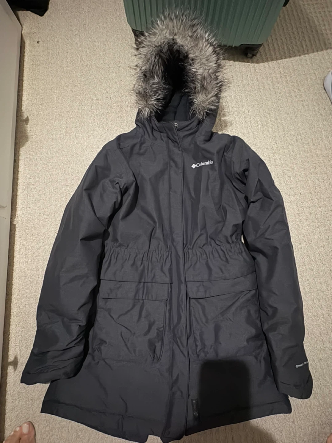 Columbia Sportswear Company parka in black, size L. It's insulated with a faux fur-trimmed hood. Features Omni-Heat reflective lining to keep you warm. Great for cold weather!