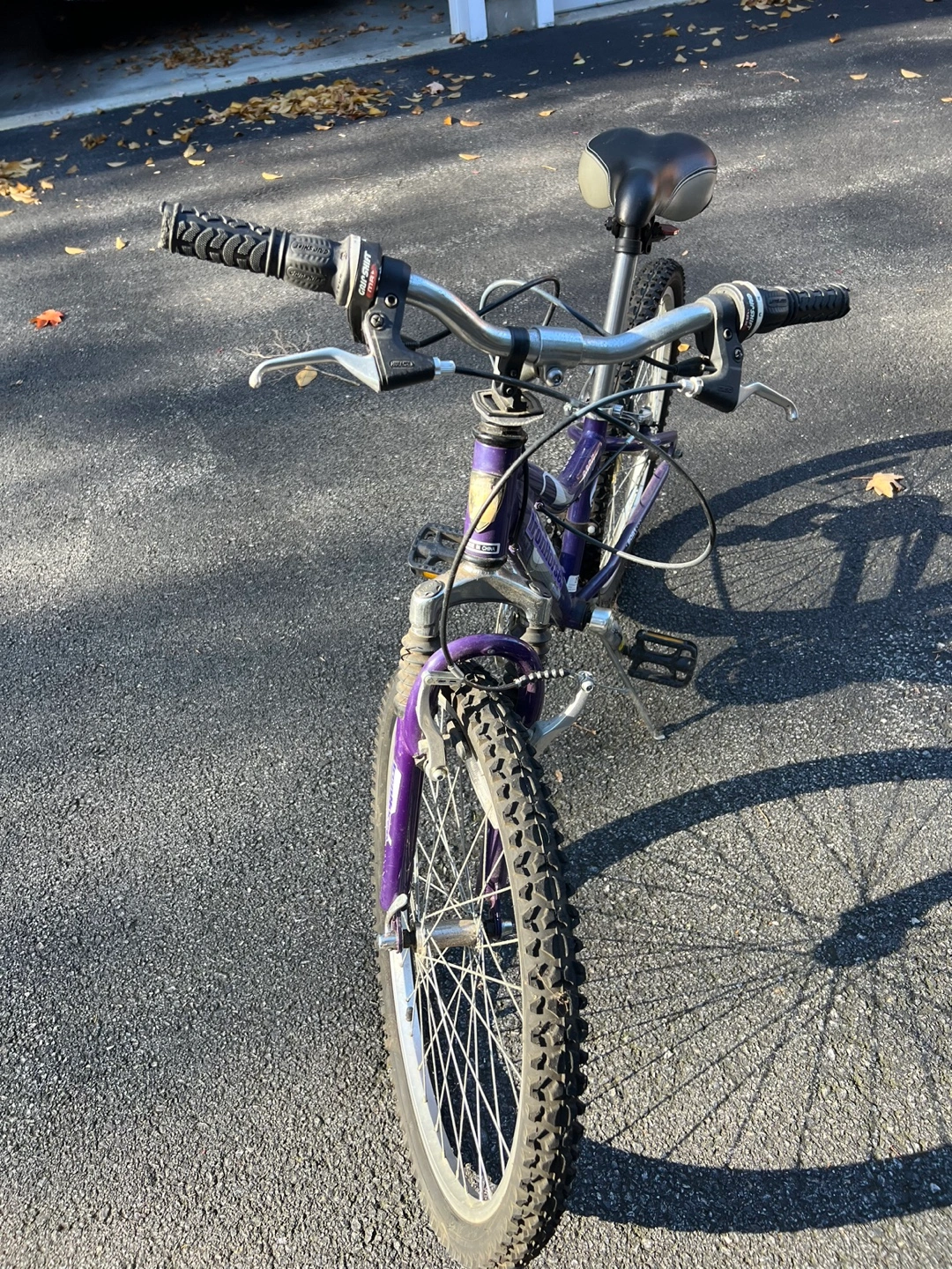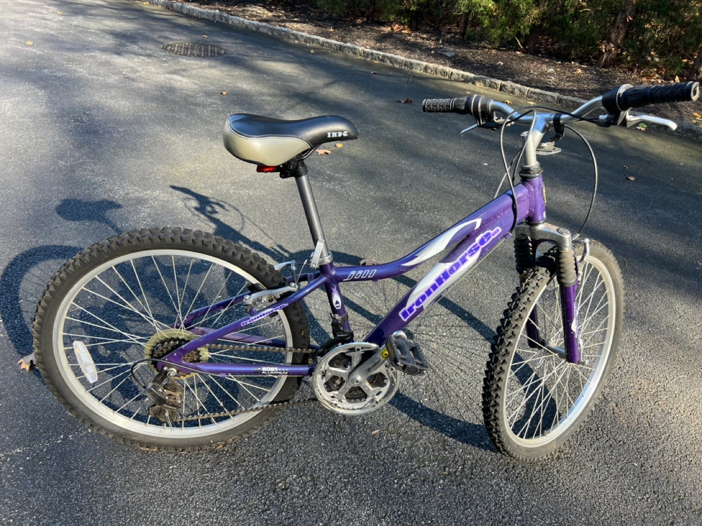 20Purple and silver mountain bike with front suspension. 24 inch wheels. Good condition. The front brakes need fine tuning. Ready for pick up from Briarcliff Manor, NY 10510 driveway or we can arrange another place convenient to both of us.