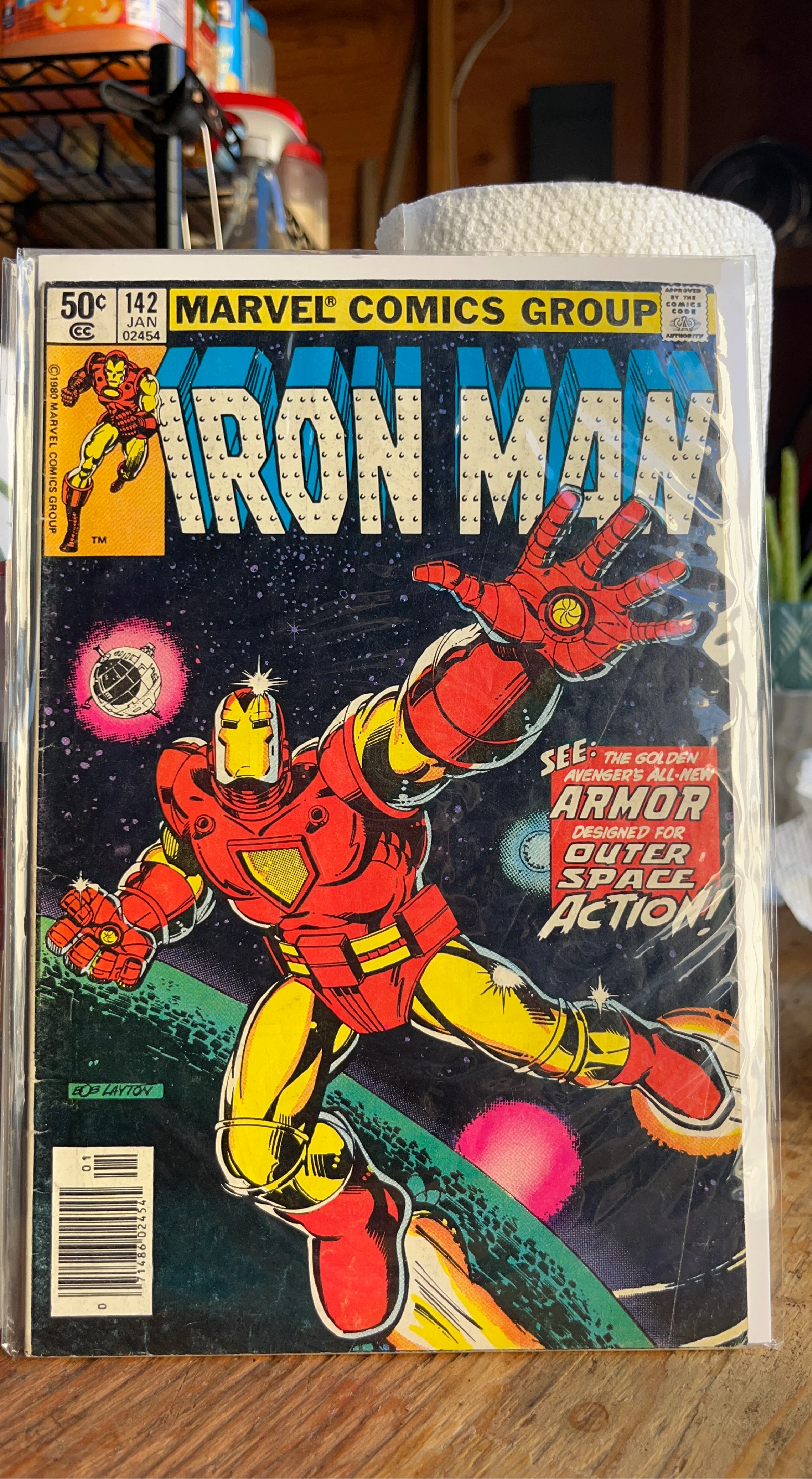 Selling a vintage Iron Man comic book, issue #142 from Marvel Comics Group. This comic features the golden avenger's all-new armor designed for outer space action! It's a cool piece for any Marvel fan or comic collector