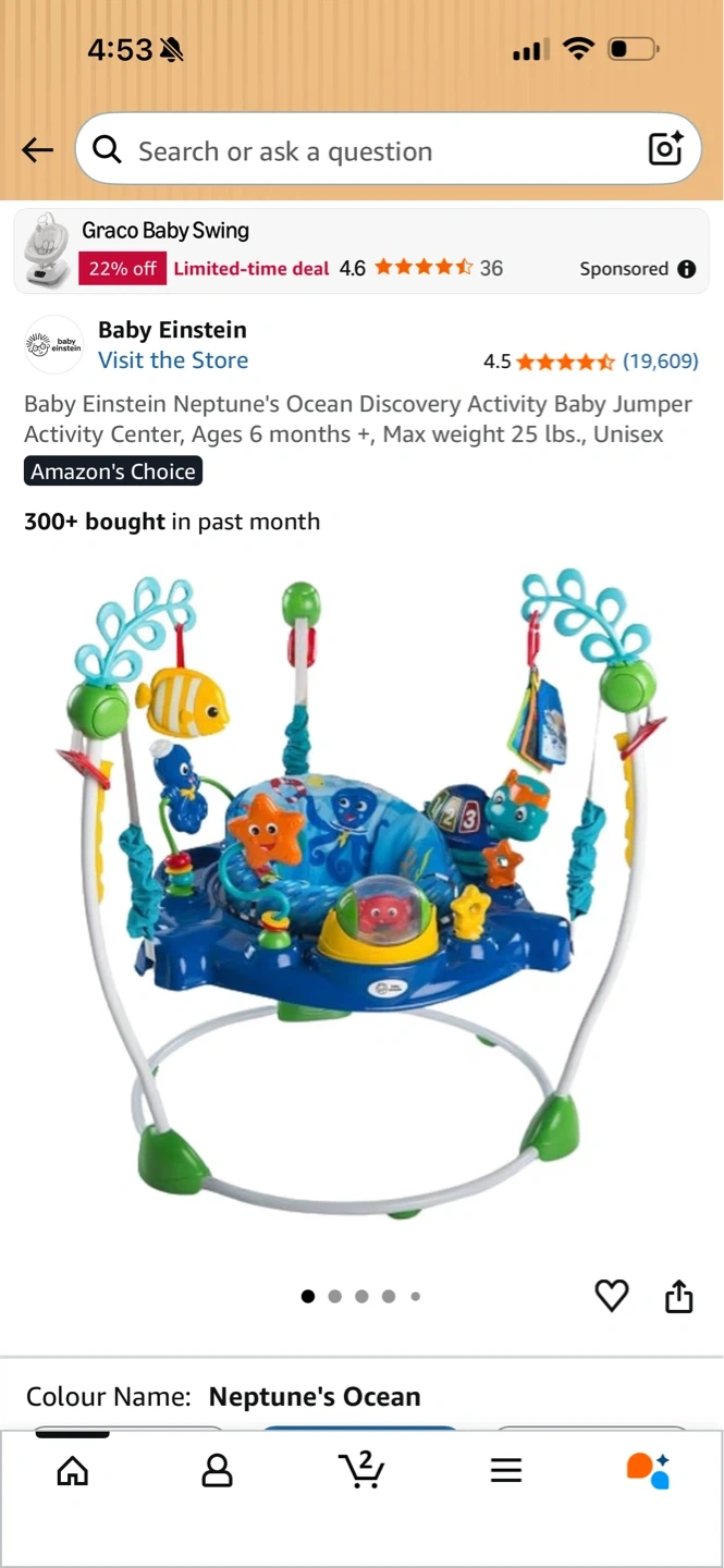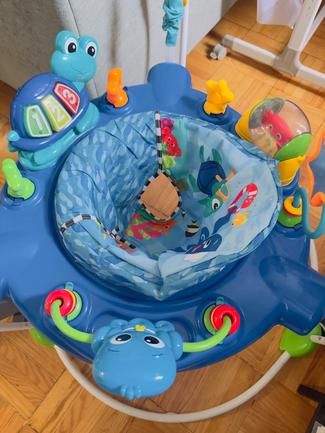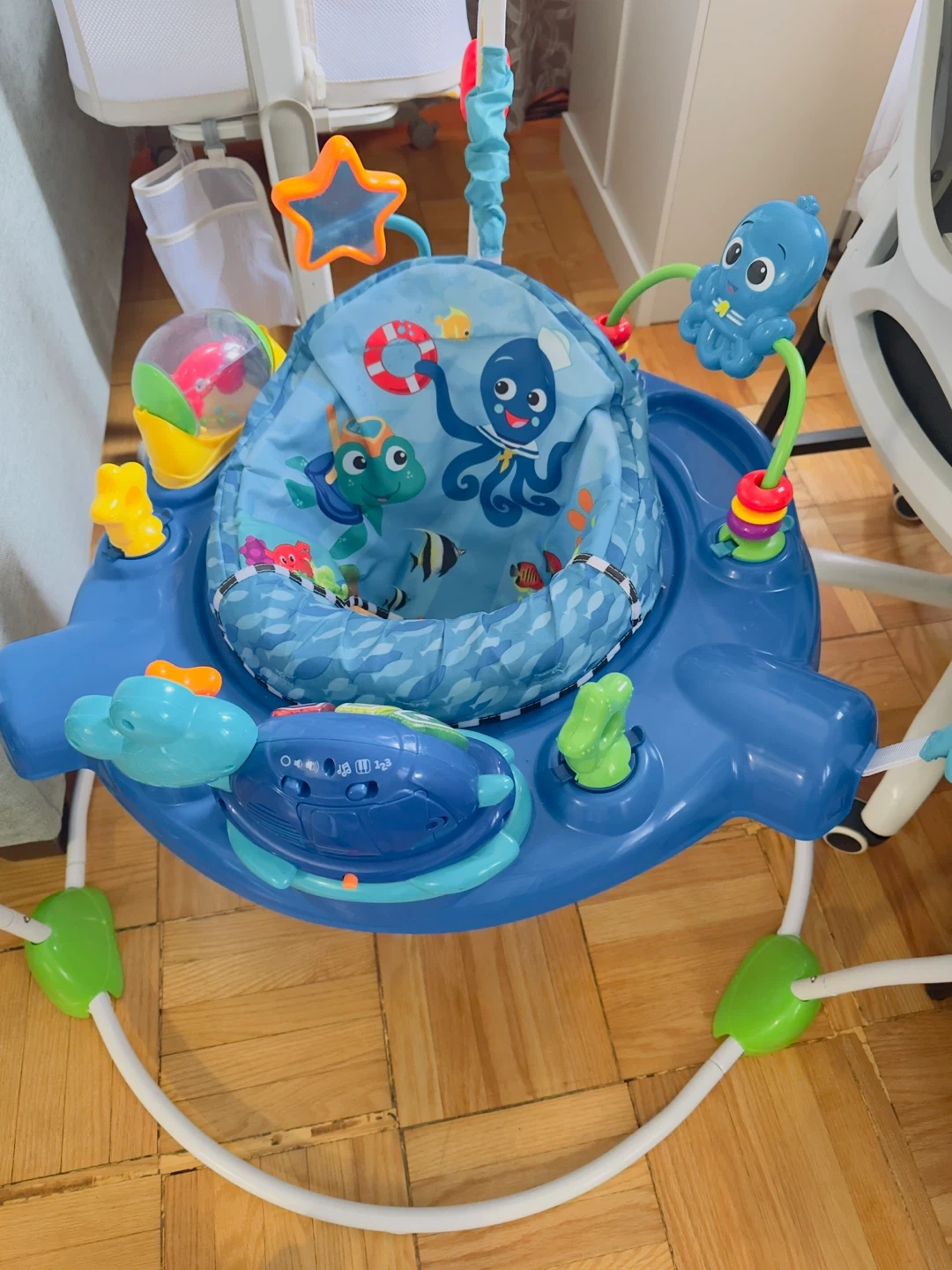 This Baby Einstein Activity baby jumper features an ocean theme with fun ocean critters. It has a 360-degree rotating seat and several attached toys. The seat lights up and plays music with interactive elements.