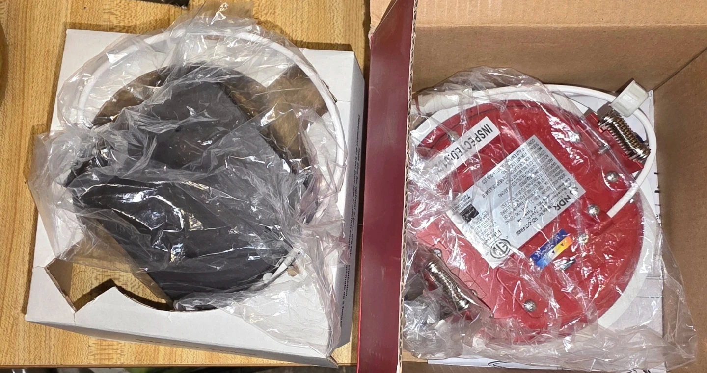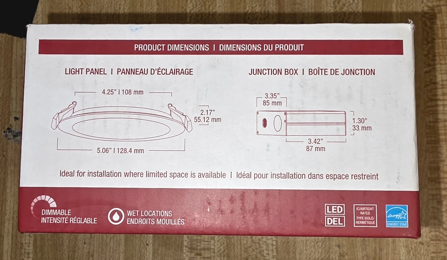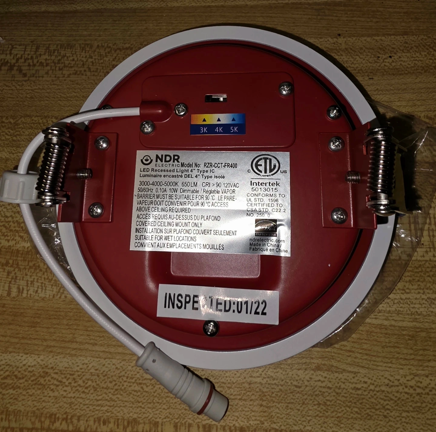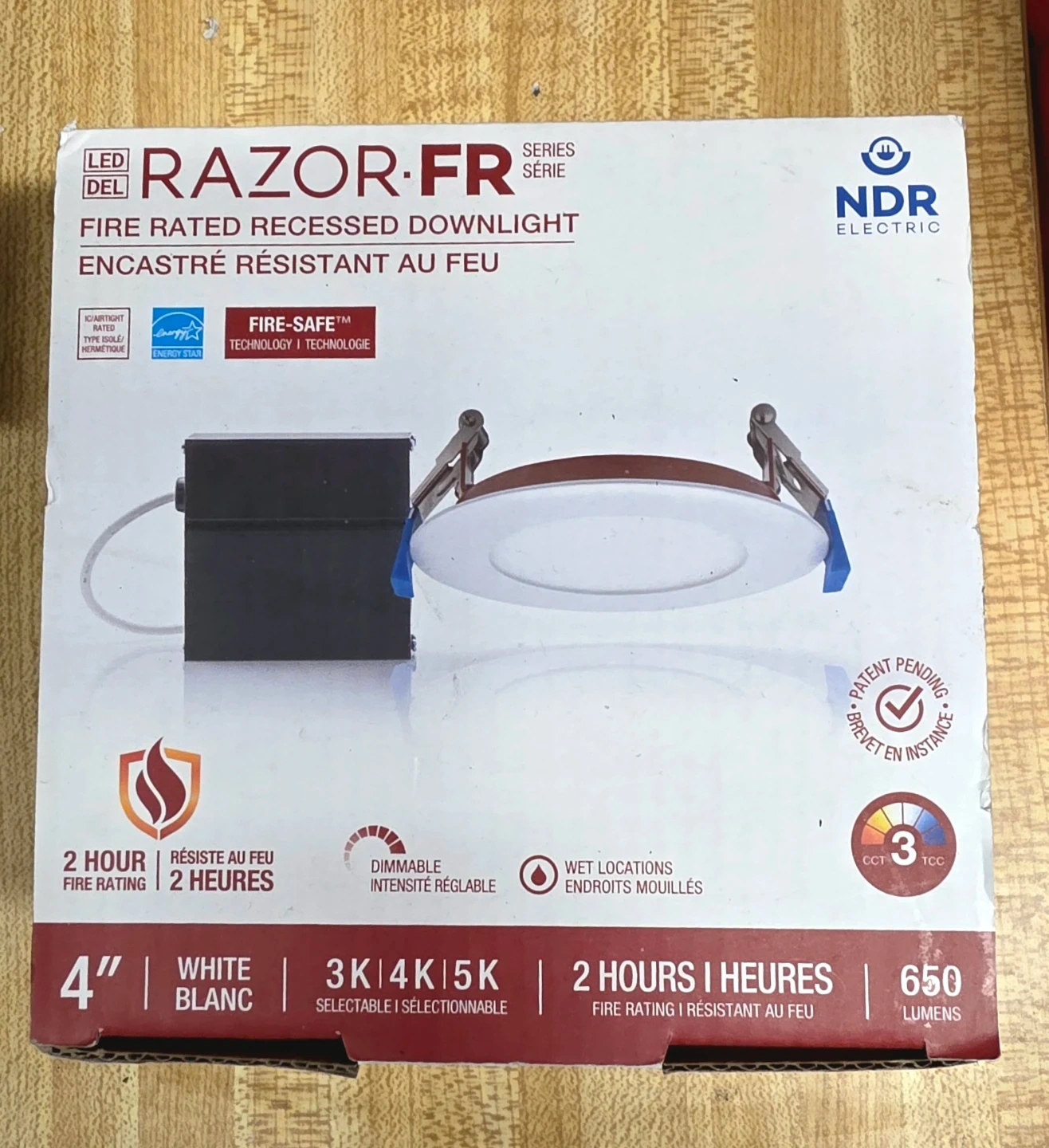 This is an NDR Electric Razor FR fire-rated recessed downlight. It's a 4-inch, white, dimmable LED light. It's suitable for wet locations and has a 2-hour fire rating. Includes original box and components.