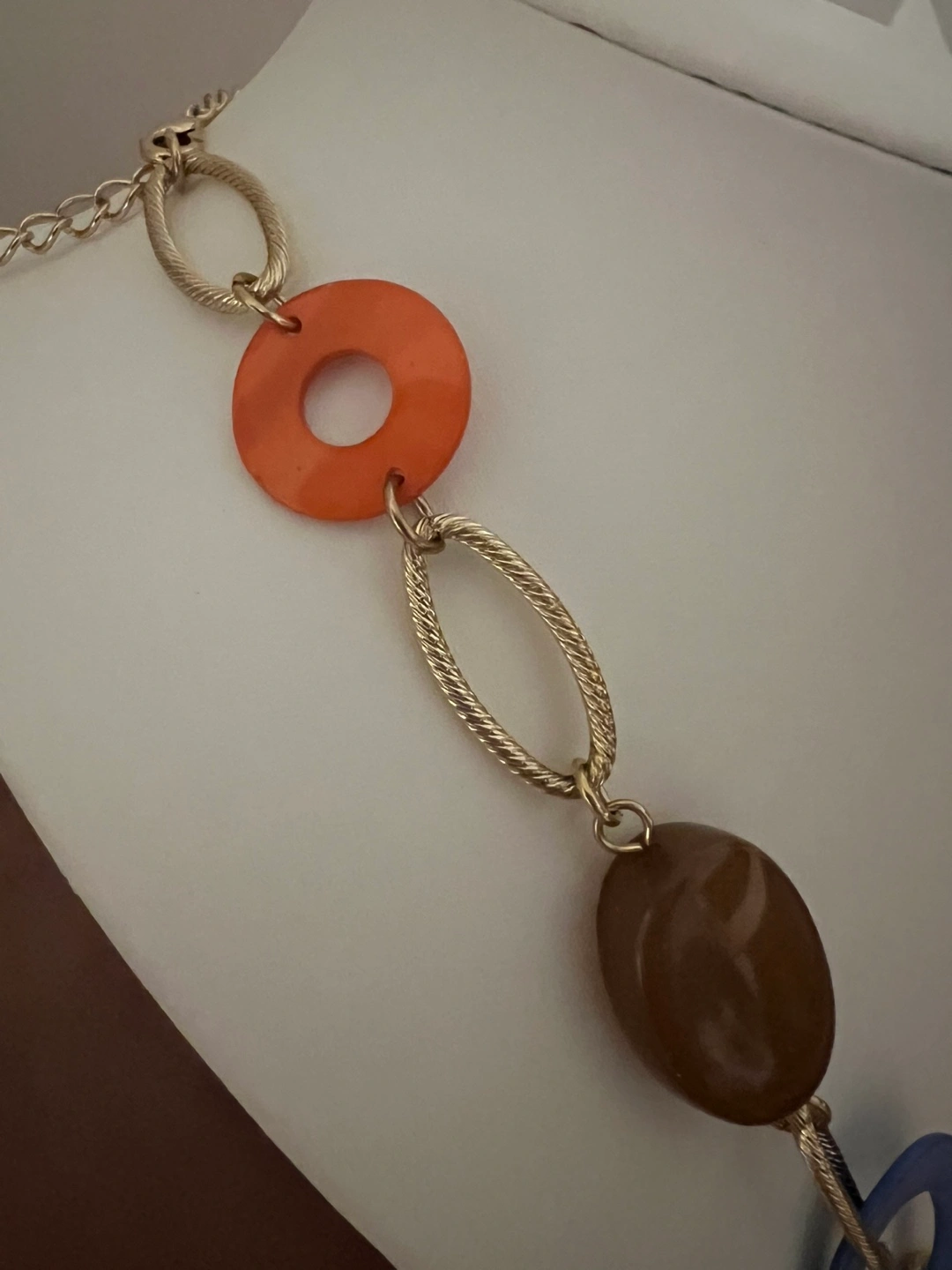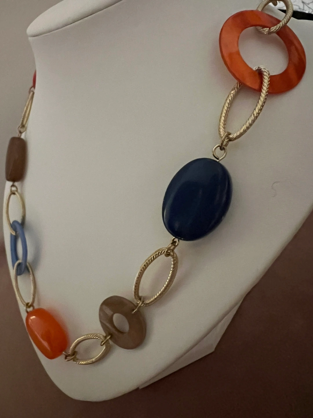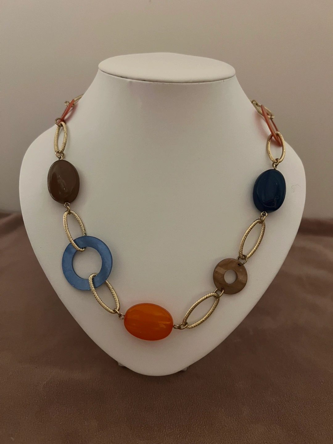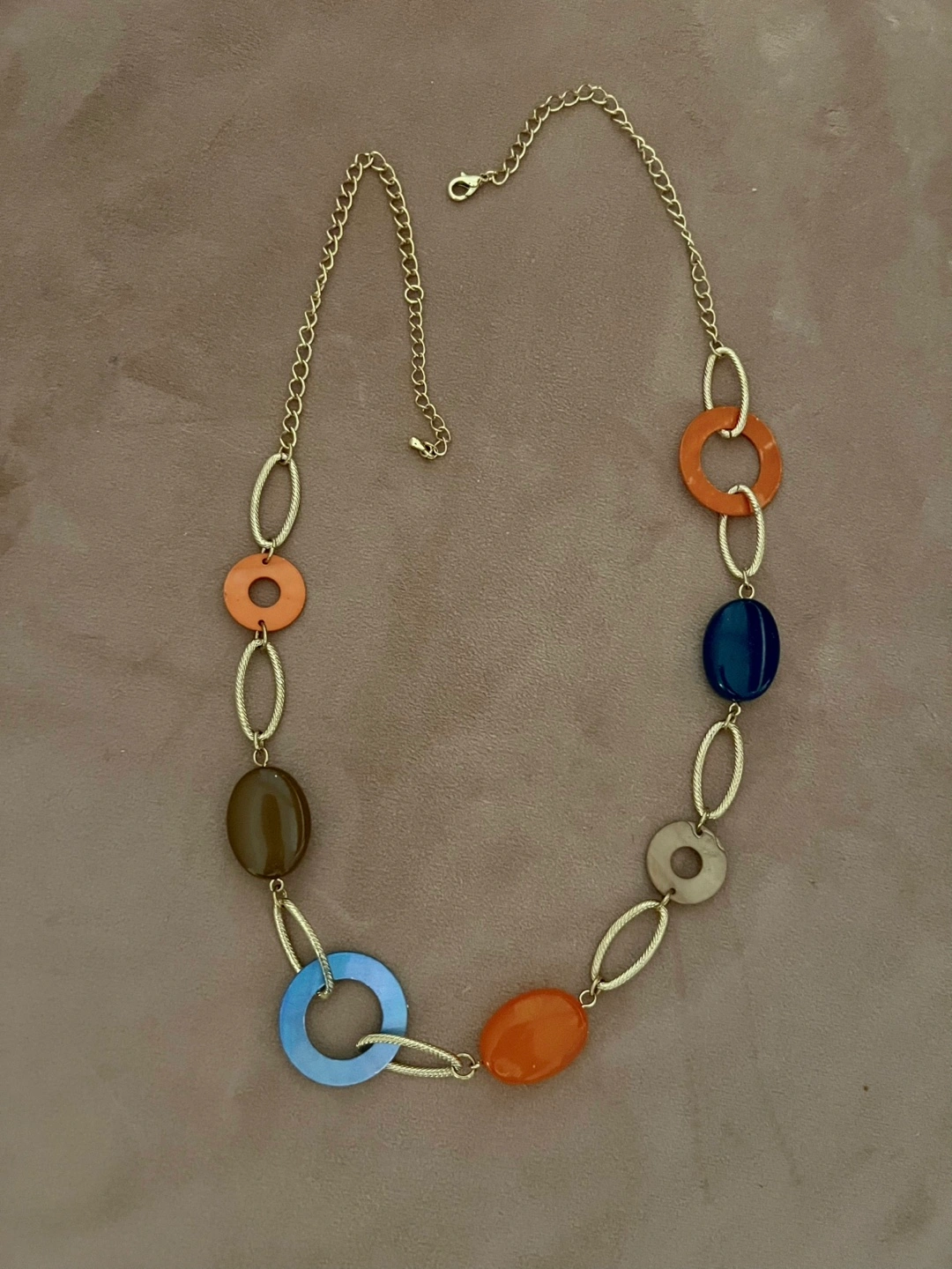 Gorgeous statement necklace. Features a gold chain with various coloured resin stones. Oval and circle shapes. Great for adding a pop of colour to any outfit.