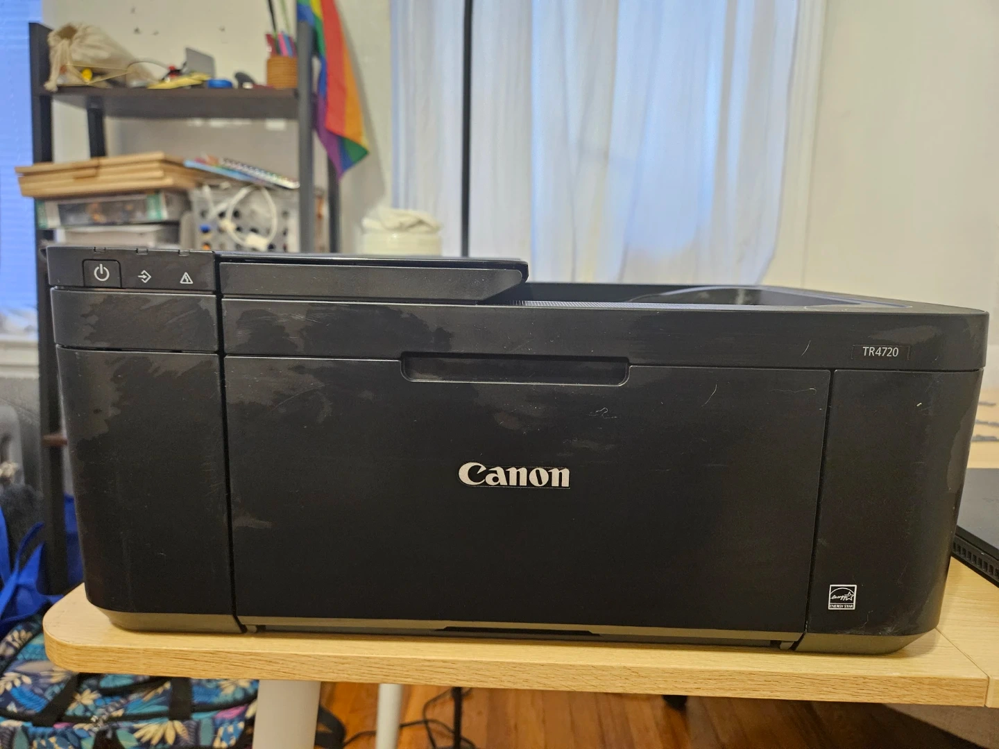 This is a Canon PIXMA TR4720 all-in-one printer. It's a black inkjet printer. It's capable of printing, scanning, and copying. This printer is suitable for home or small office use.