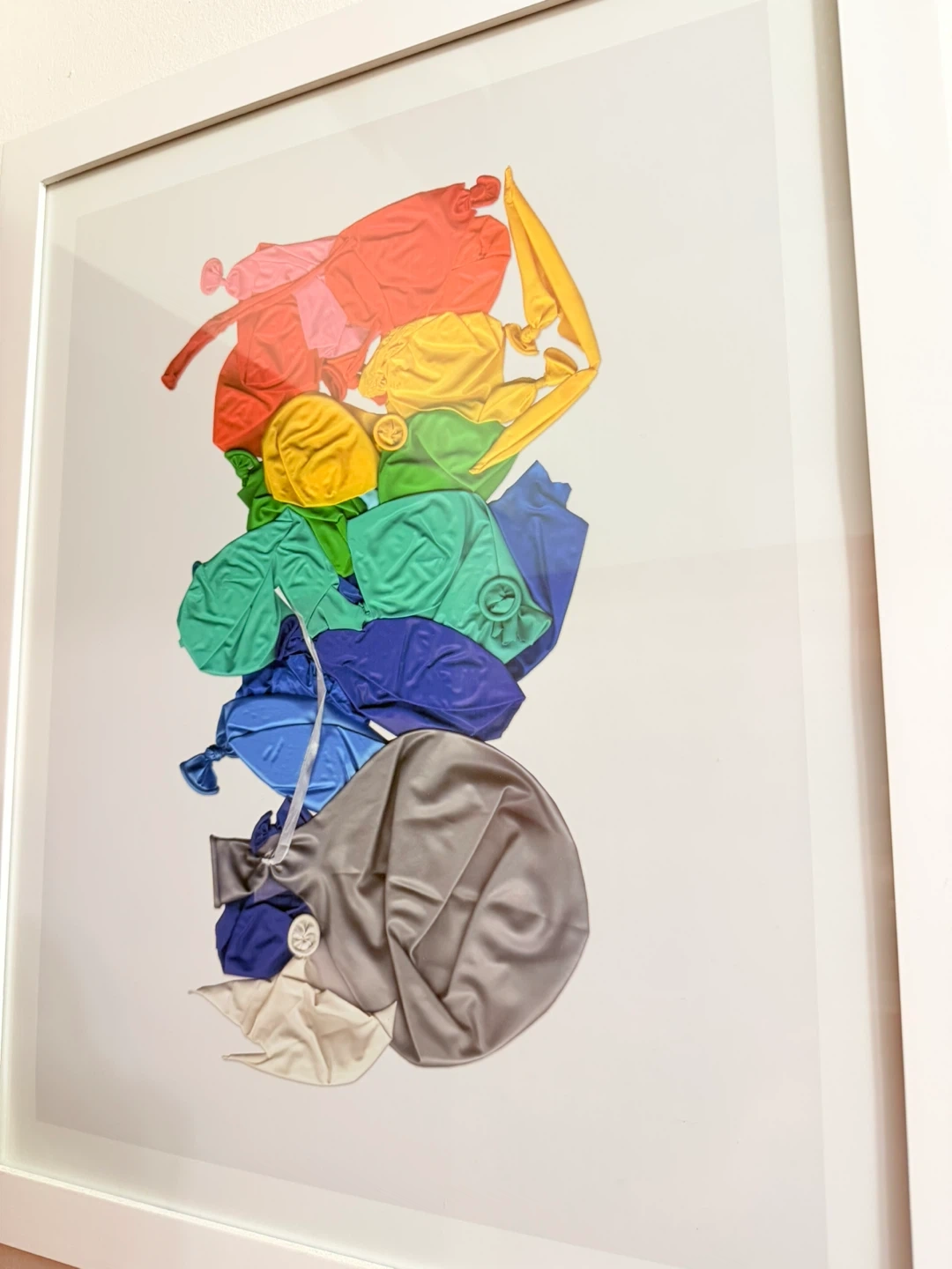 This framed art print features a striking arrangement of deflated balloons in a vibrant rainbow of colors, including red, orange, yellow, green, blue, and gray. The artwork is presented in a clean white frame, ready to add a pop of color and modern flair to any space. It's a unique piece that captures the ephemeral nature of celebration.
