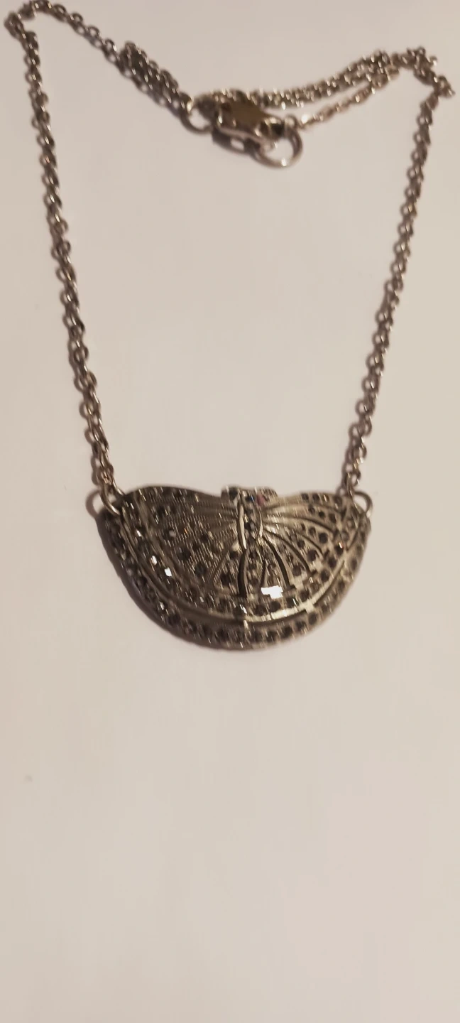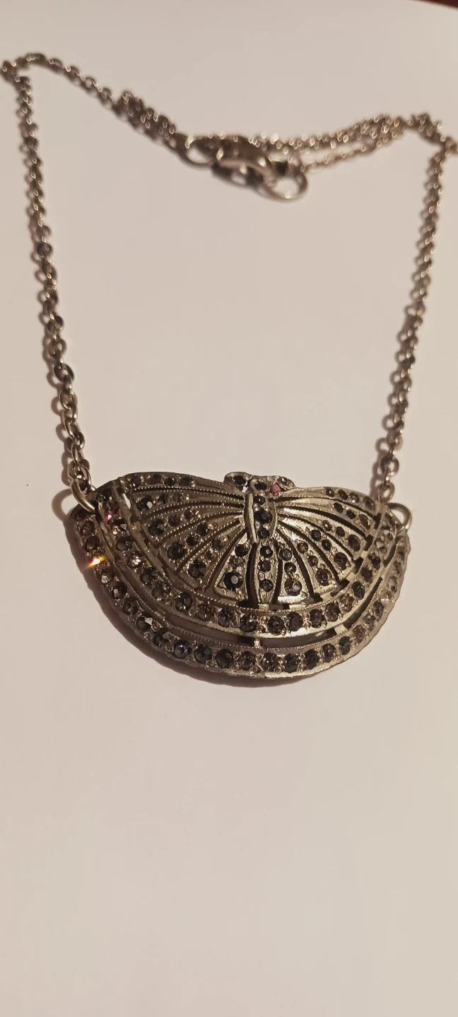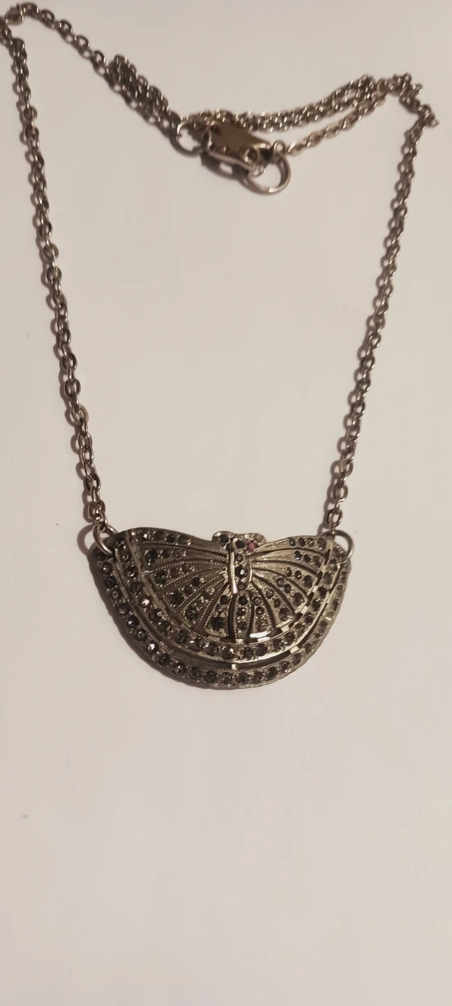 This silver tone necklace features a detailed butterfly pendant adorned with small dark rhinestones. It has a delicate chain with a standard clasp closure. The pendant has a fan-like design with a central butterfly.