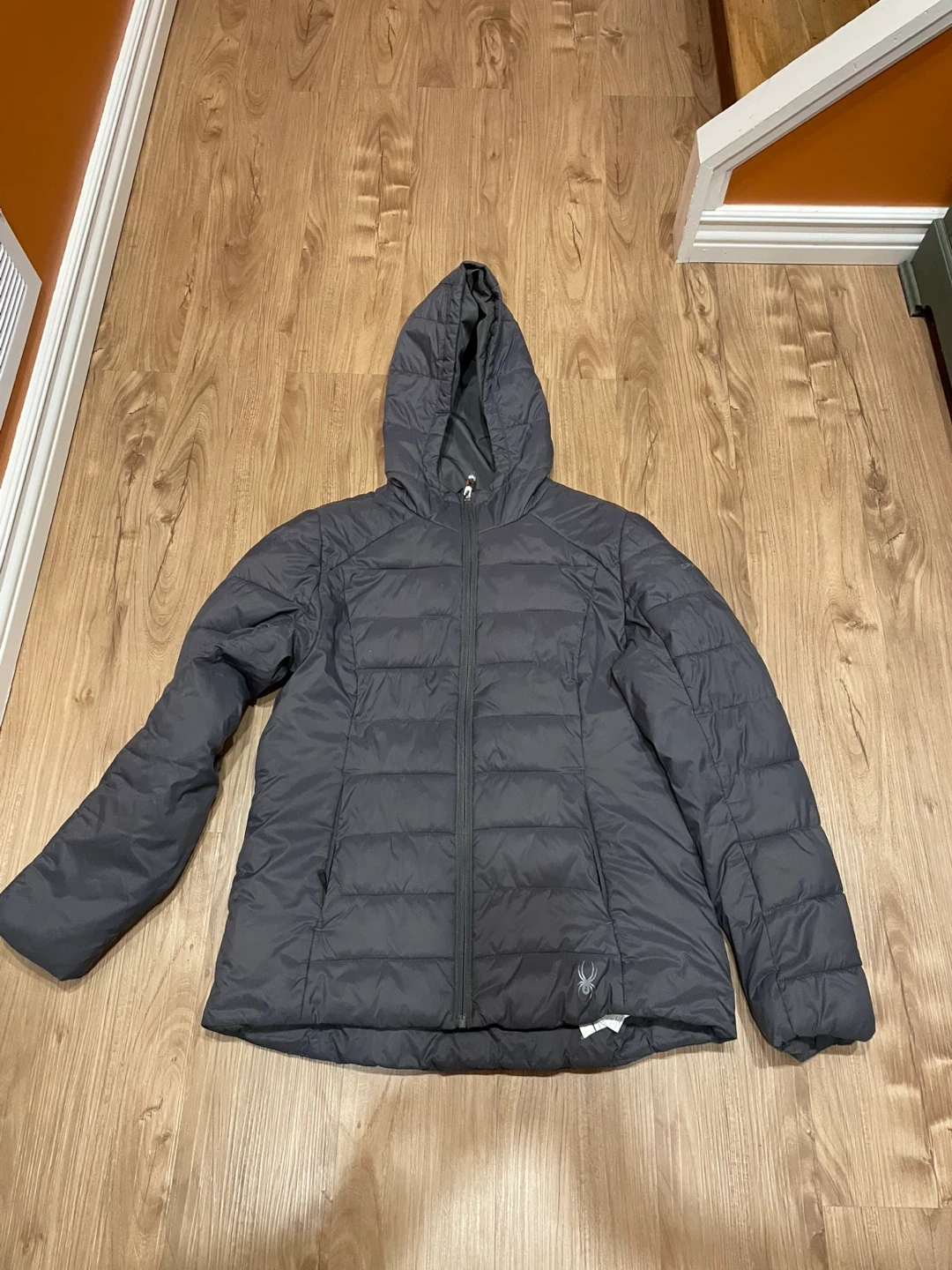 Selling a Spyder puffer jacket in size medium. It's a stylish and warm jacket, perfect for the cooler weather. The jacket is in great condition and ready for a new home!