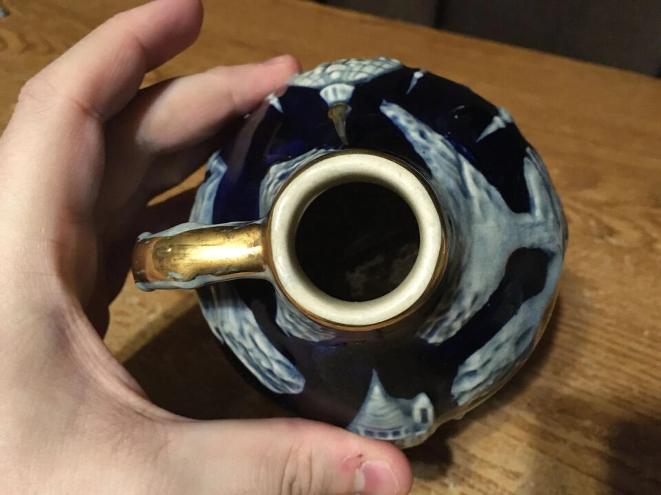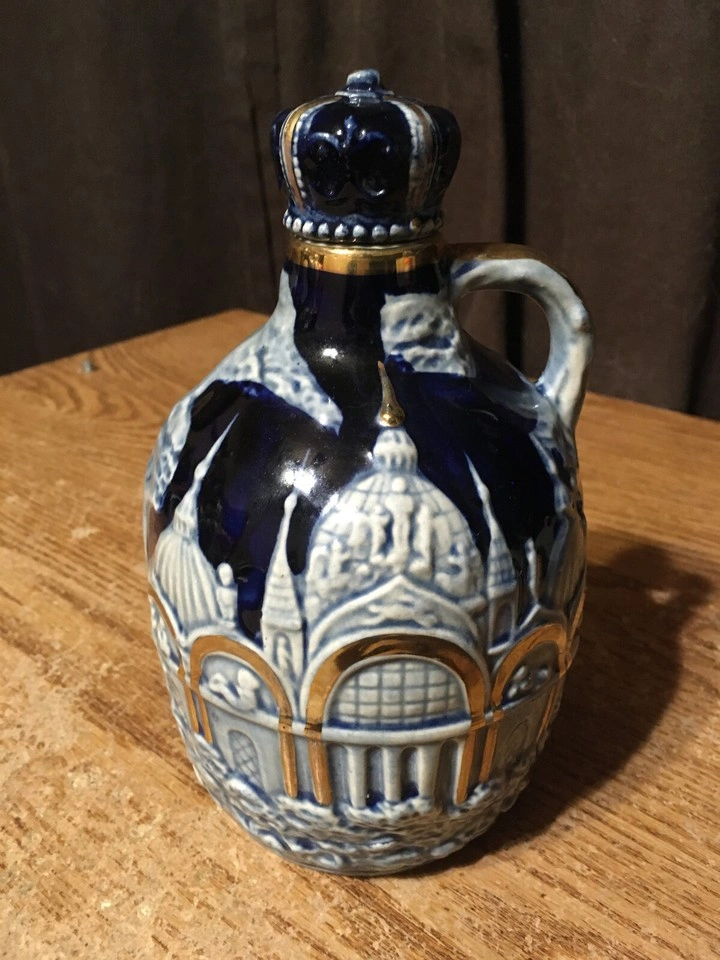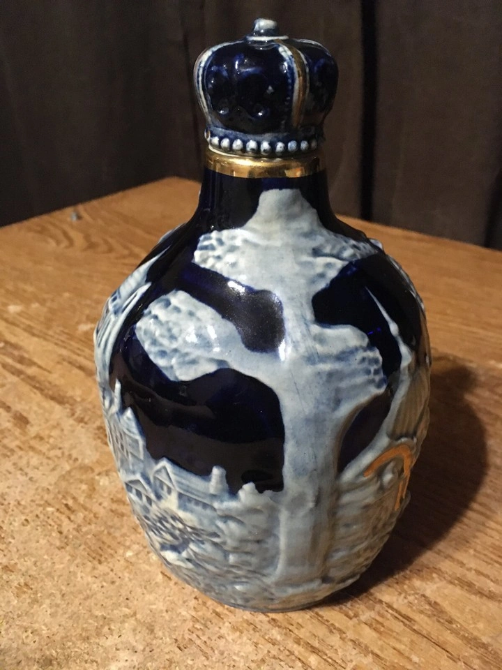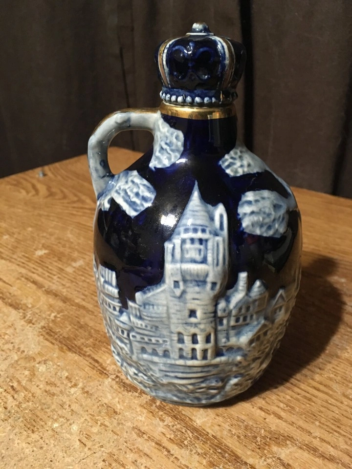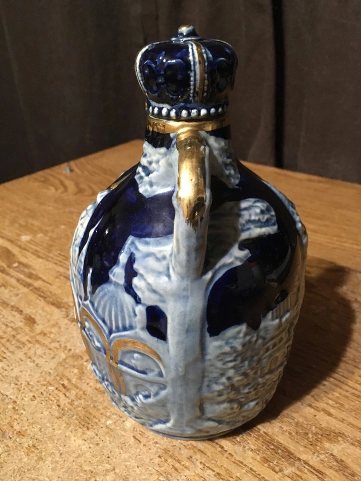 Small ceramic bottle. Features a cobalt blue glaze and white relief detailing. Depicts a castle and other buildings. Crown-shaped stopper with cork. Handle on the side. Unique collector's item. good condition pick up at house