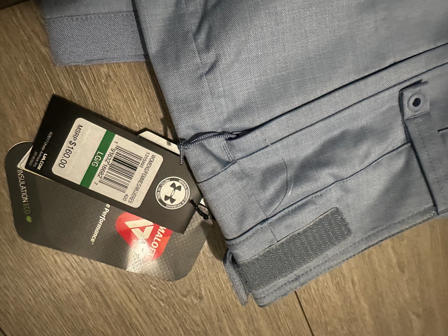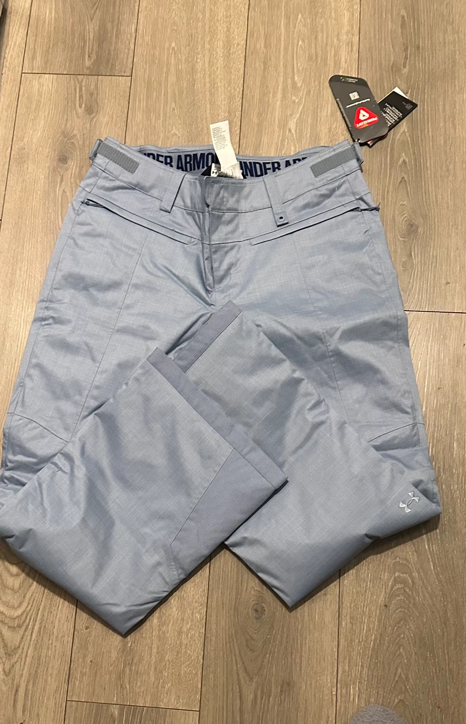 Women's Under Armour pants designed for cold weather activities. They feature ColdGear Infrared technology and insulation for warmth. The size is L, and the color is a light blue.