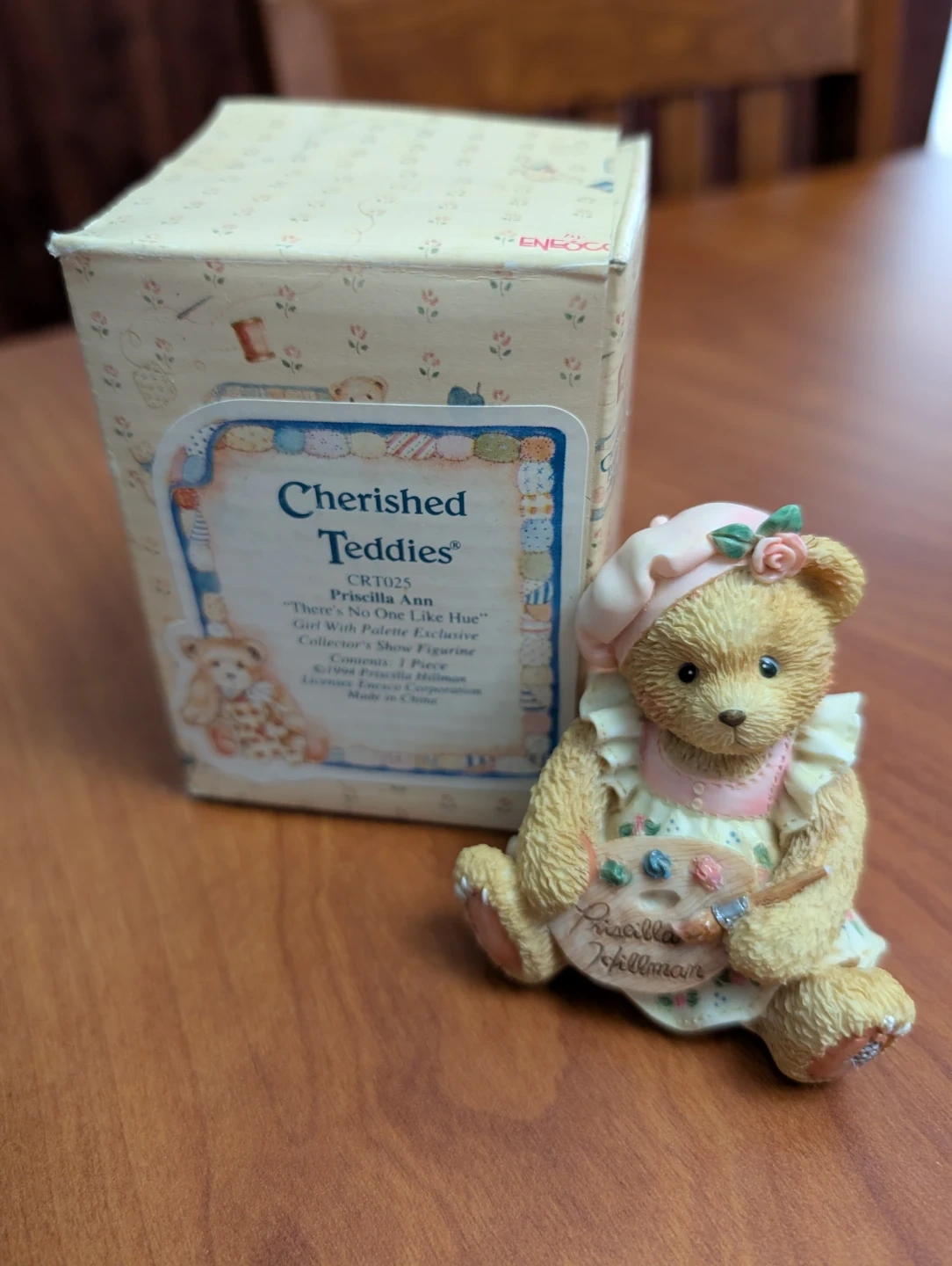 This Cherished Teddies figurine features Priscilla Ann with a palette. It's a 1994 collector's show piece. Made in China.