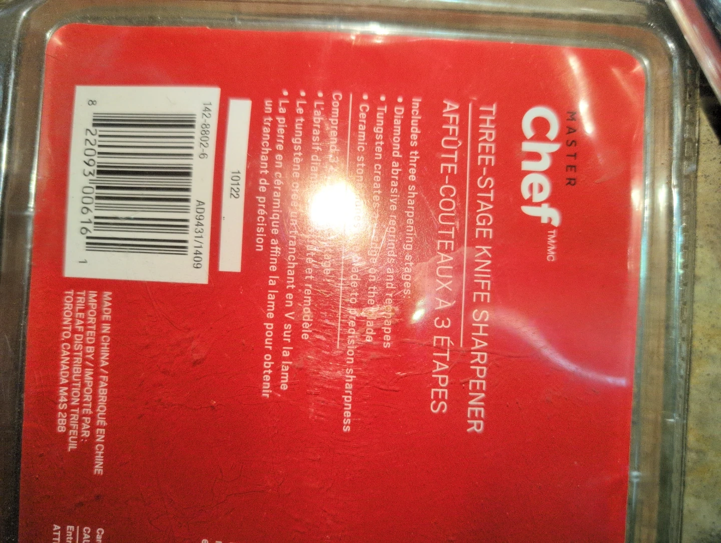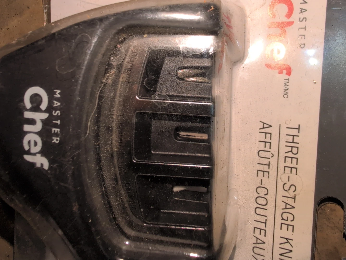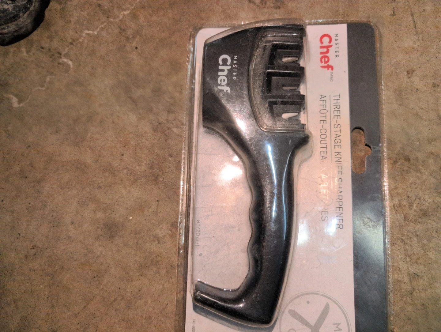This Master Chef knife sharpener features three sharpening stages. It includes diamond abrasive, tungsten carbide, and ceramic sharpening stones. It's designed for sharpening all types of knives.