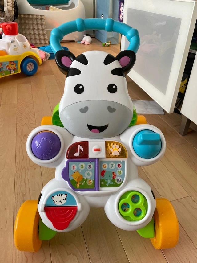 The Fisher-Price Learn with Lights Zebra Walker is a great way to keep your little one moving and learning! It features lights and sounds to stimulate your baby, a sturdy four-wheel design for stability, an easy-to-grip handle, and interactive buttons and activities. There is some damage on the alphabet sticker. Condition: Used - Good. Cash accepted.