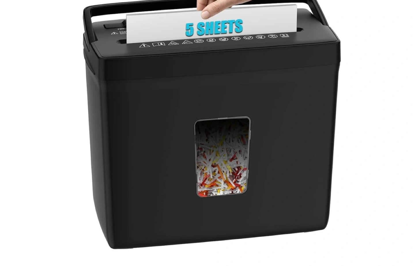 This is a black paper shredder. It shreds up to 5 sheets at a time. It has a convenient handle for carrying. The clear window shows when the bin is full.
