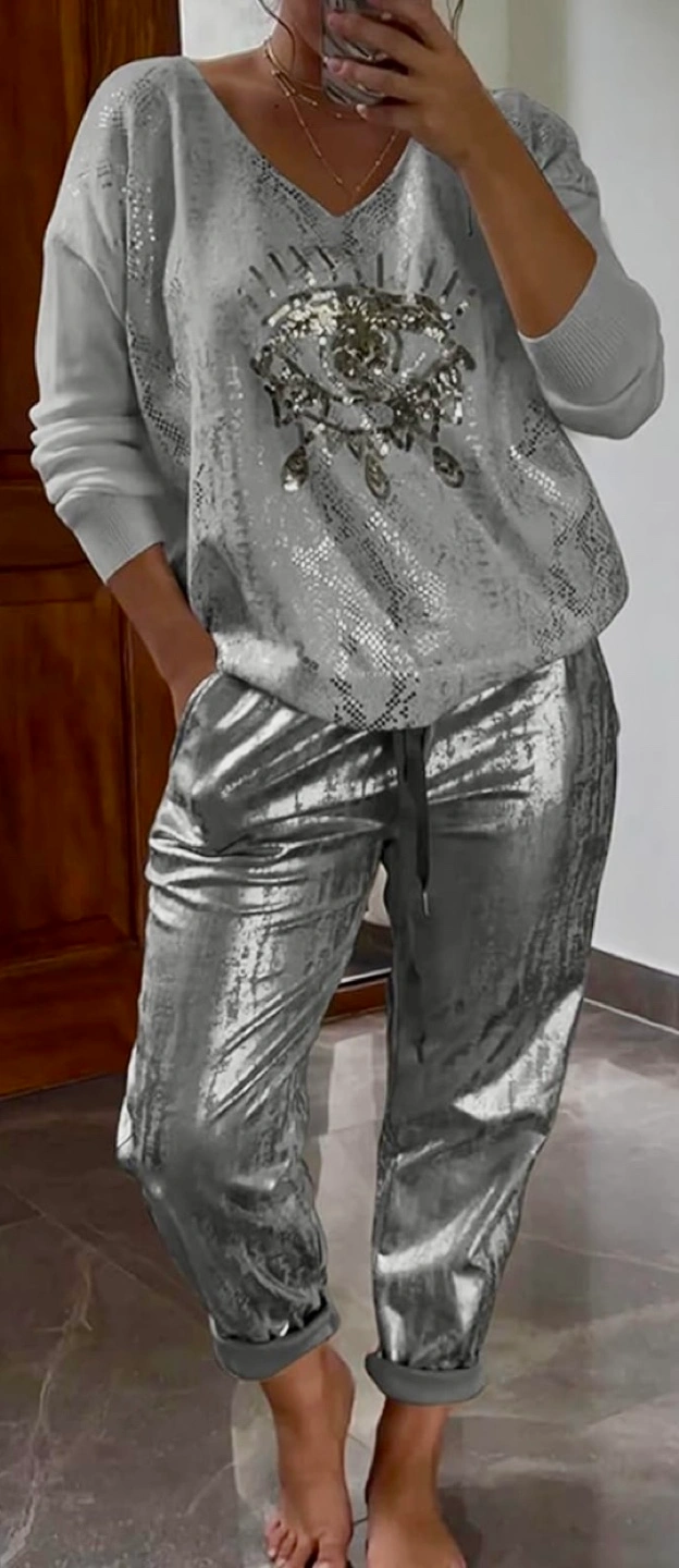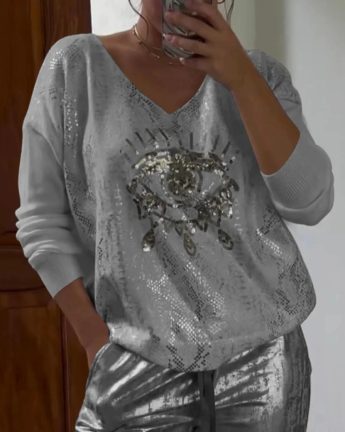 Long sleeve, v-neck, grey top with snake print and sequins,
