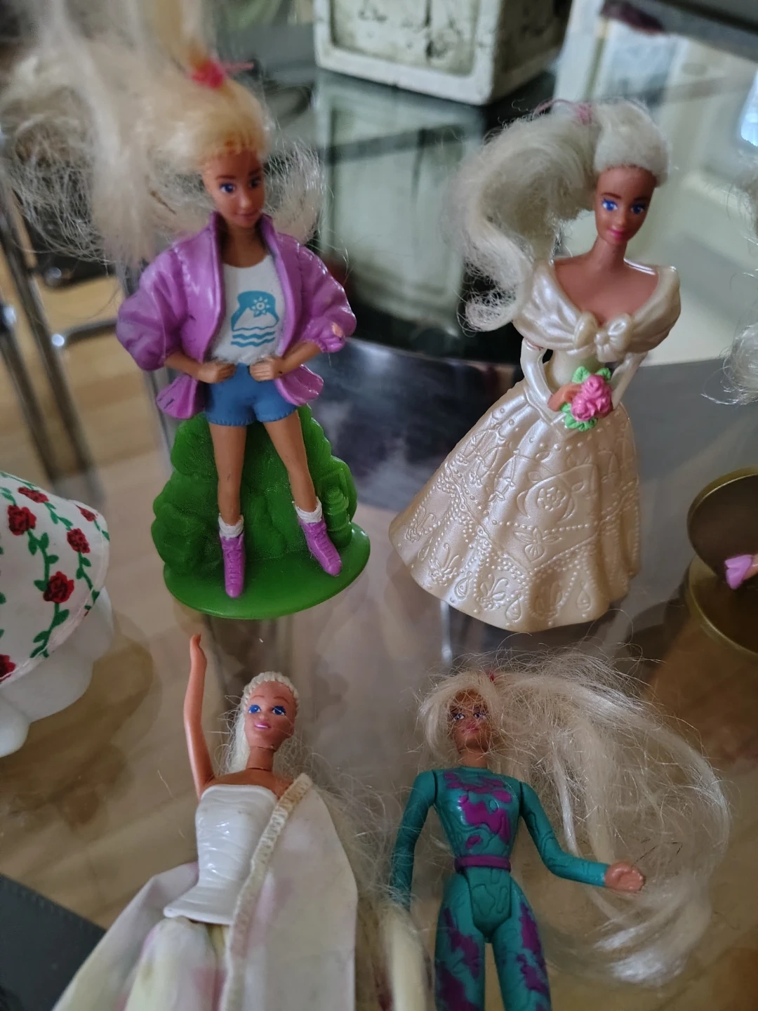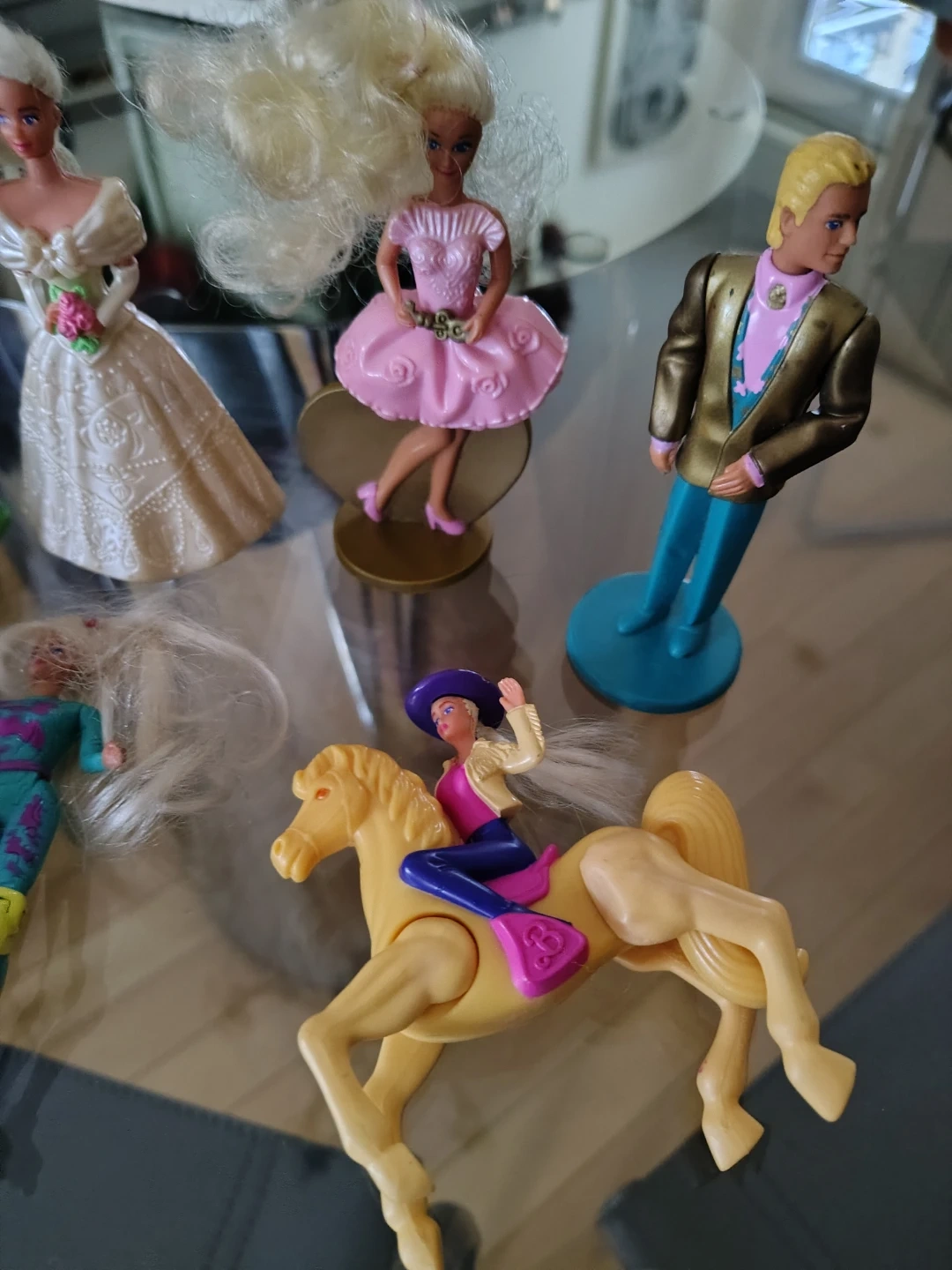 Fun blast from the past! Set of 8 McDonald’s Barbies and 1 Ken, all from the 90s and carefully stored in a box ever since. Clean, bright, and ready for their next home.