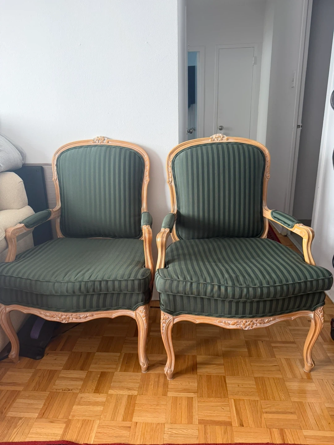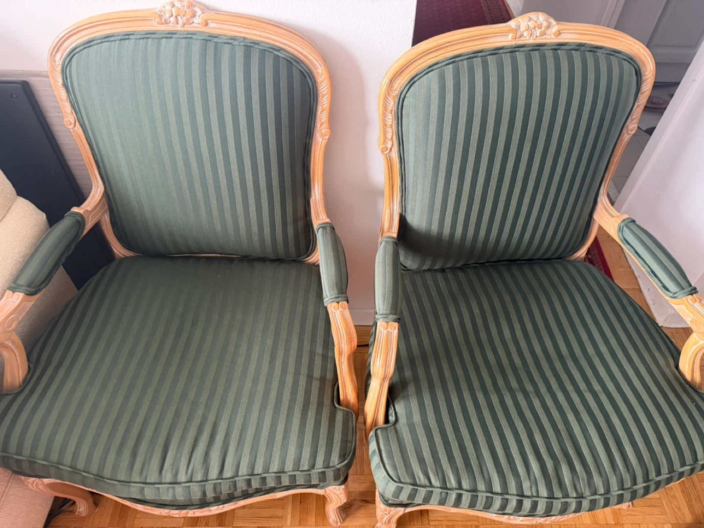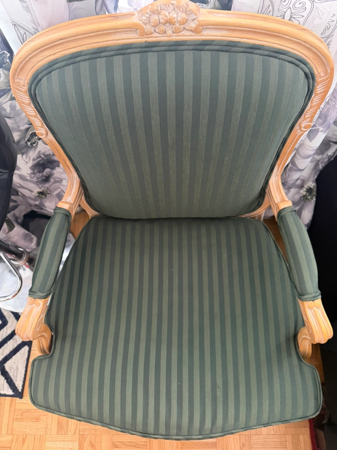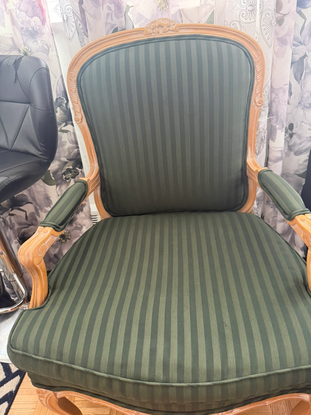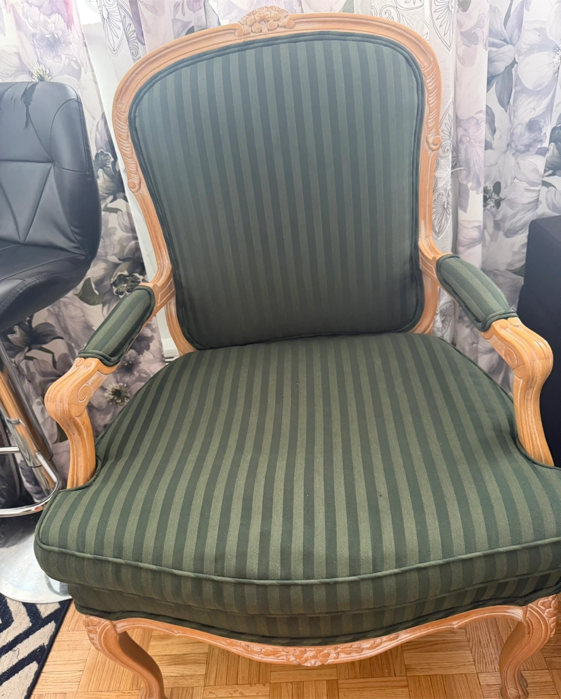 Moving Selling a lovely green striped accent chairs. It's in great shape and would be a stylish addition to any room. The chairs features a wooden frame with a beautifully carved top. The seat and backrest are upholstered with a striped fabric in shades of green. Perfect for adding a touch of elegance to your home!