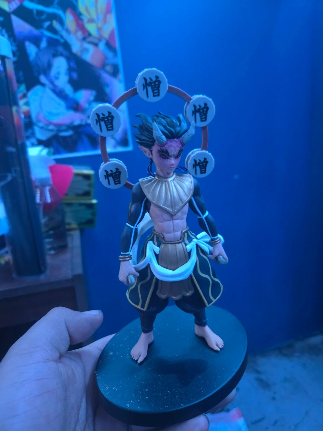 This is an anime action figure. It depicts a character with horns and unique clothing. The figure stands on a black base and has a circular accessory above its head with Japanese characters.