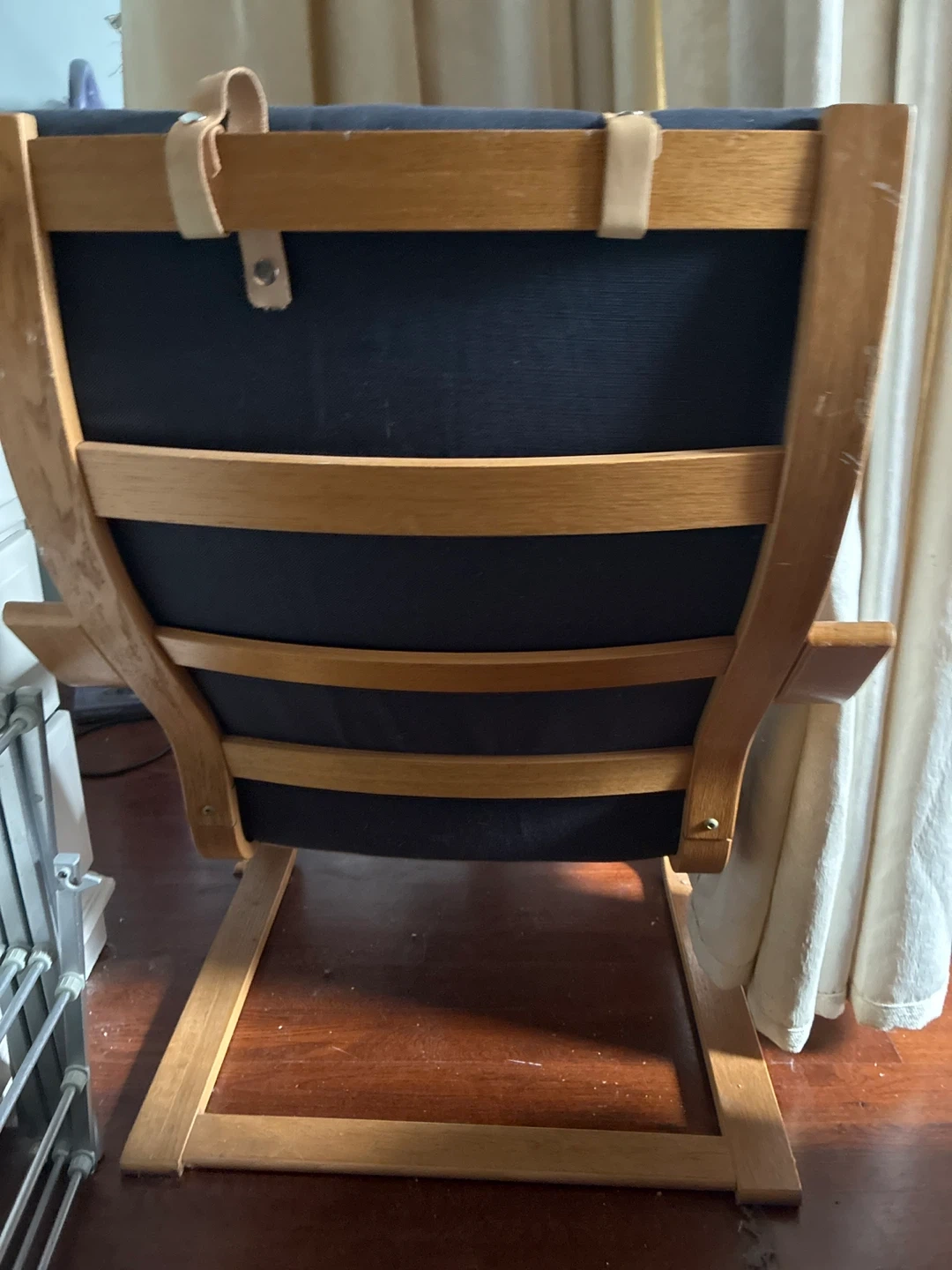 Comfortable wooden lounge chair featuring a navy blue upholstered cushion and a matching pillow. The frame's natural wood finish complements the dark upholstery. It's suitable for relaxing in a living room or den.