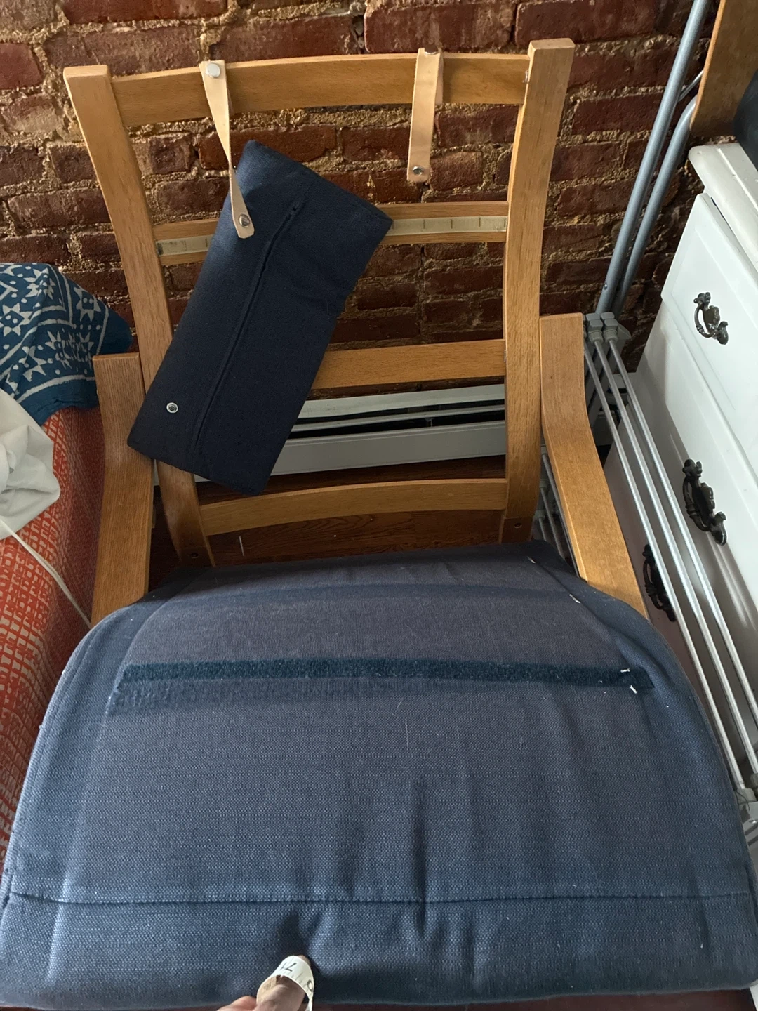 Wooden Lounge Chair with Navy Blue Cushion and Pillow