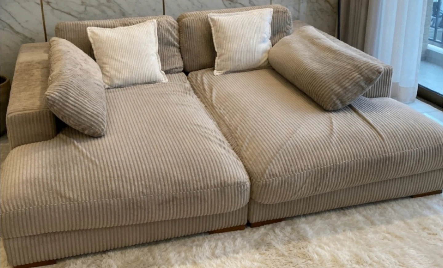 Beige corduroy modular sofa sectionals. Hooked together as one piece, but can also be unhooked and used as two separate chaise lounge style pieces. Comes with plush back cushions and bolster pillows. Upholstered in a soft, textured corduroy fabric. Amazing for movie nights!