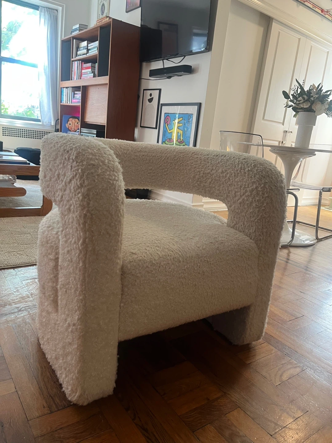 Selling a stylish ivory boucle accent chair! It's in great condition and ready to add a cozy touch to your space. The chair measures 29 inches in height and 27.5 inches in both width and depth, making it a comfortable and chic addition to any room