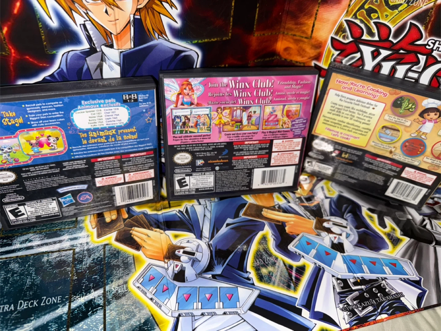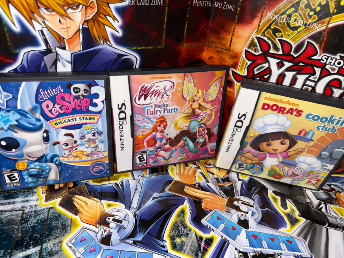 Bundle of three Nintendo DS games: Littlest Pet Shop 3, Winx Club: Magical Fairy Party, and Dora the Explorer's Cooking Club. All games are rated E for Everyone.