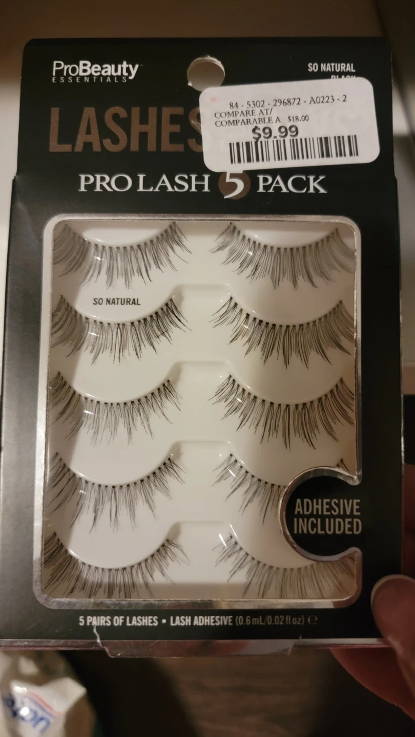 This is a 5-pack of ProBeauty Essentials Pro Lash in 'So Natural' style. It includes lash adhesive. This lash set is black and designed for a natural look.