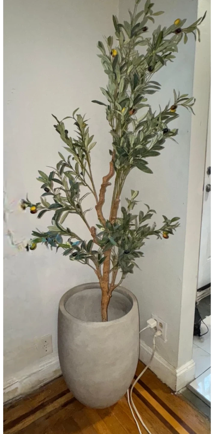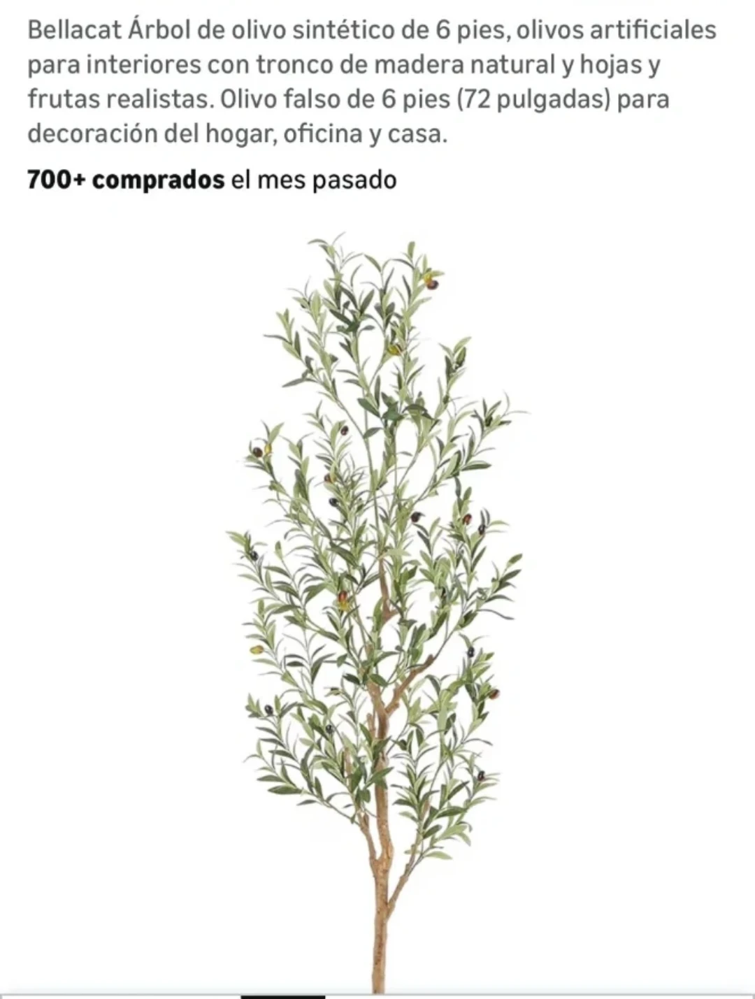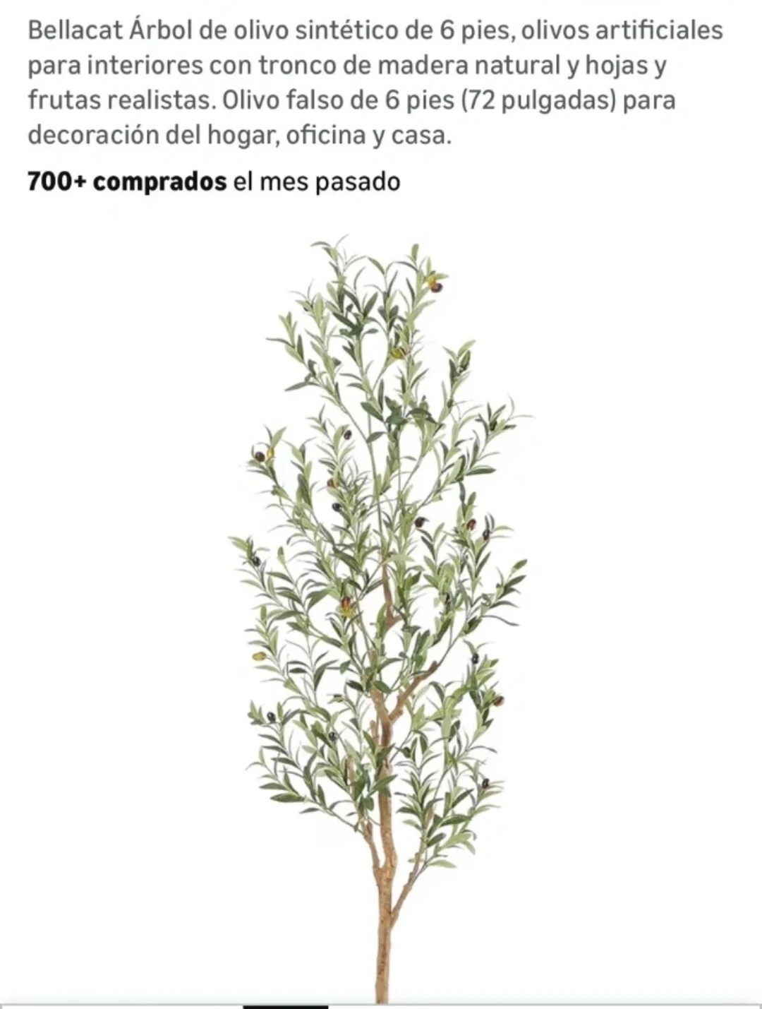 This Bellacat artificial olive tree stands 6 feet tall. It features realistic leaves and olives on a natural wood trunk. It's designed for home and office decoration.