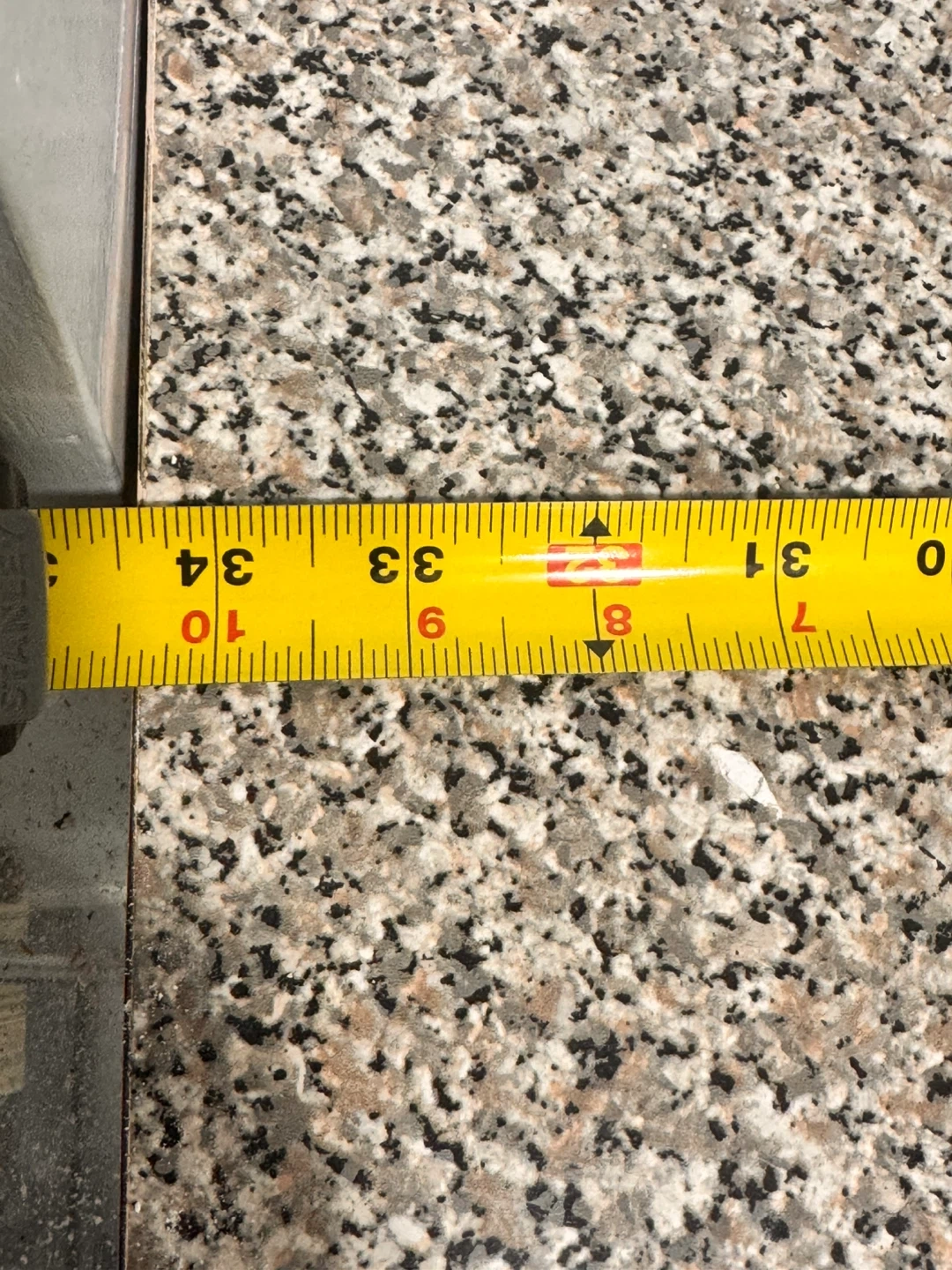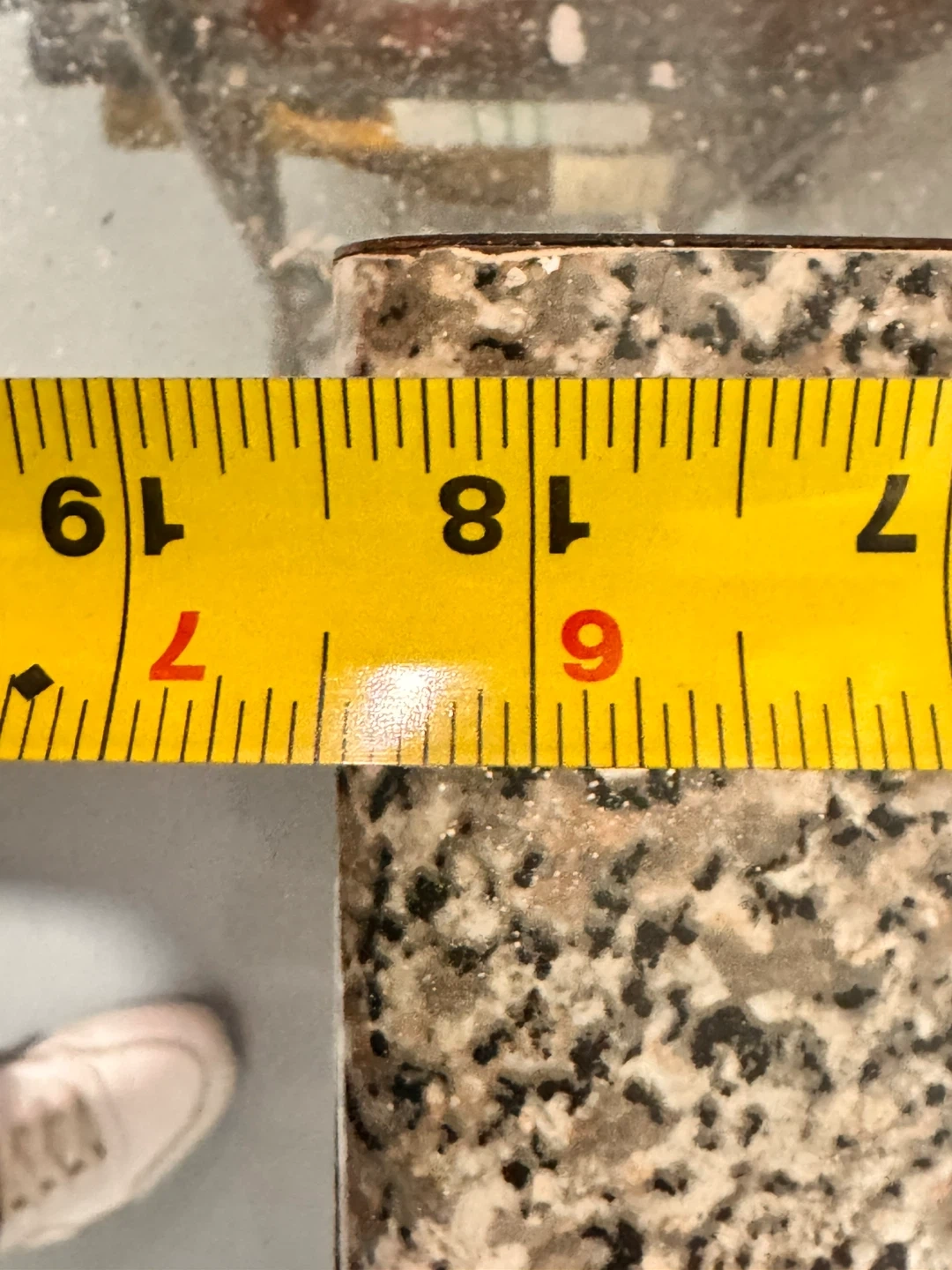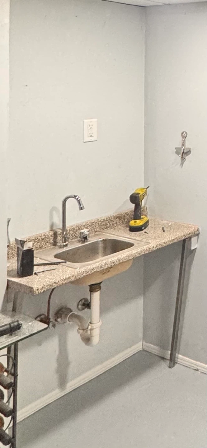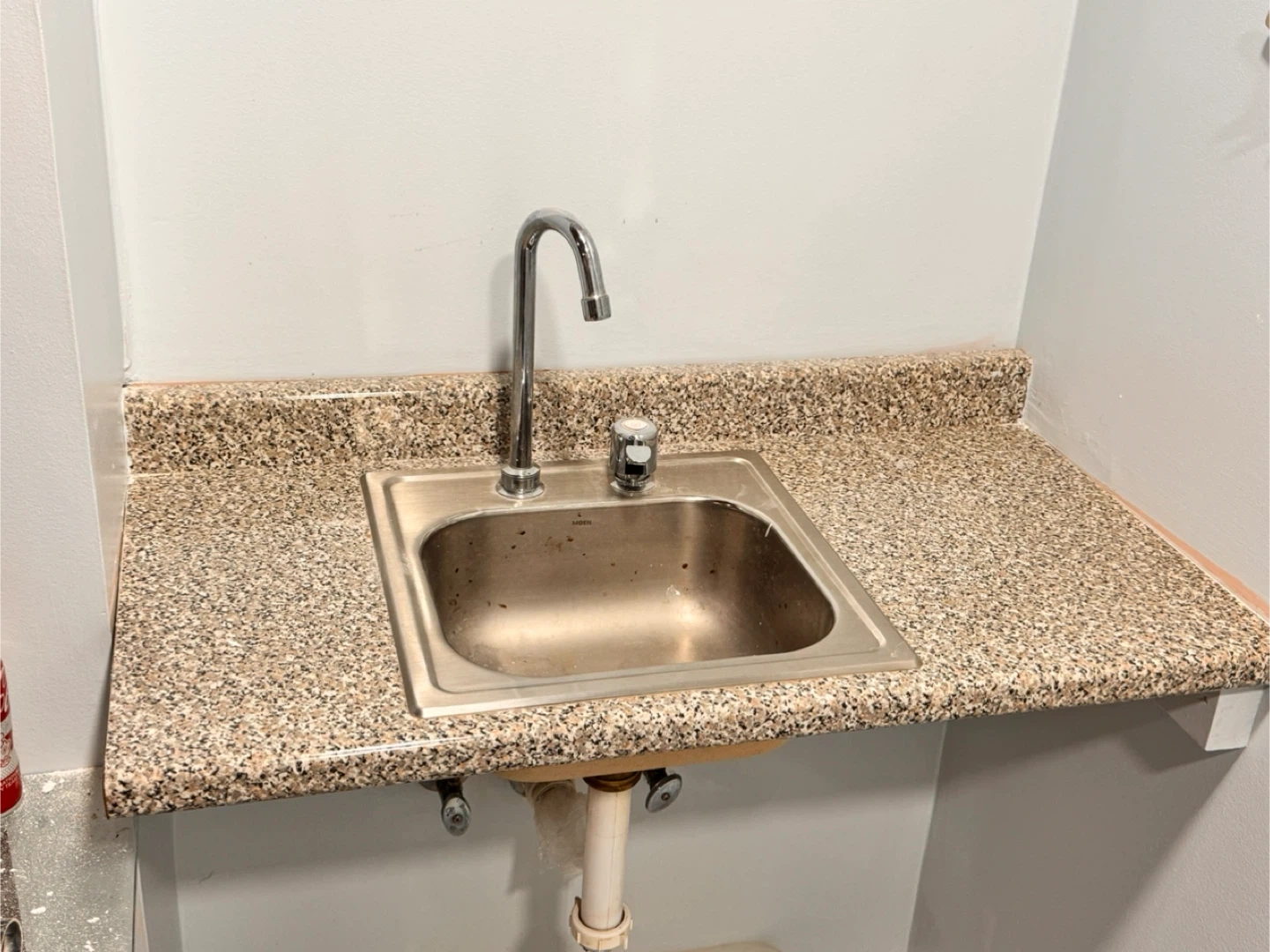 Single basin utility sink with a chrome faucet. Countertop is granite composite. Sink basin measures approximately 18 inches by 19 inches. The countertop extends beyond the sink.