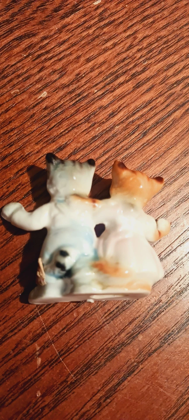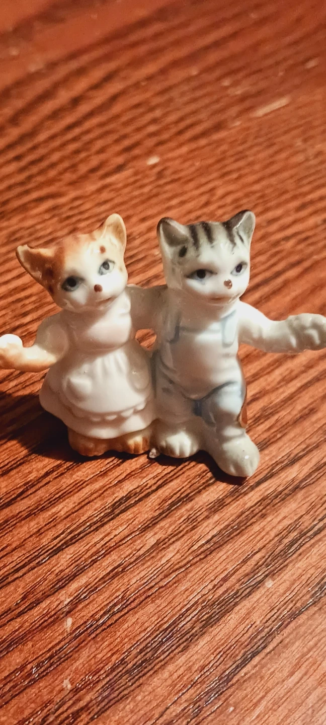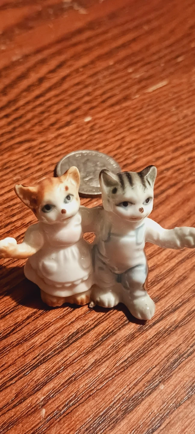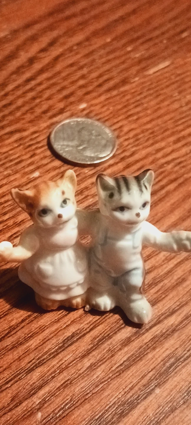 Pair of cute old vintage miniature ceramic dancing kitten/ cat figurines, one orange and white, the other gray and white with stripes. They're designed with their arms around each other. These charming little figures are made of ceramic. 2"Γ2". Excellent condition. ALL MY PRICES ARE NEGOTIABLE !!