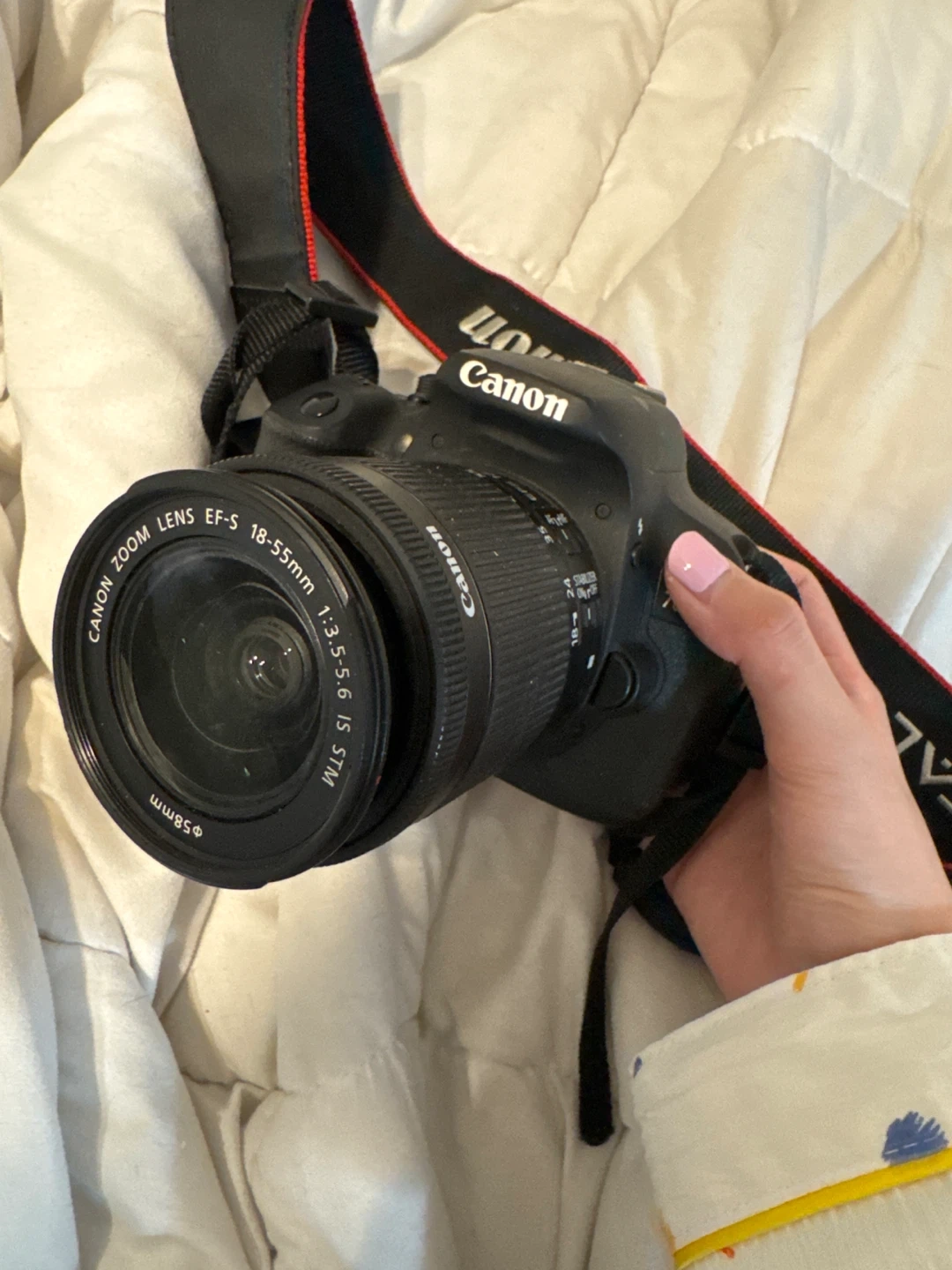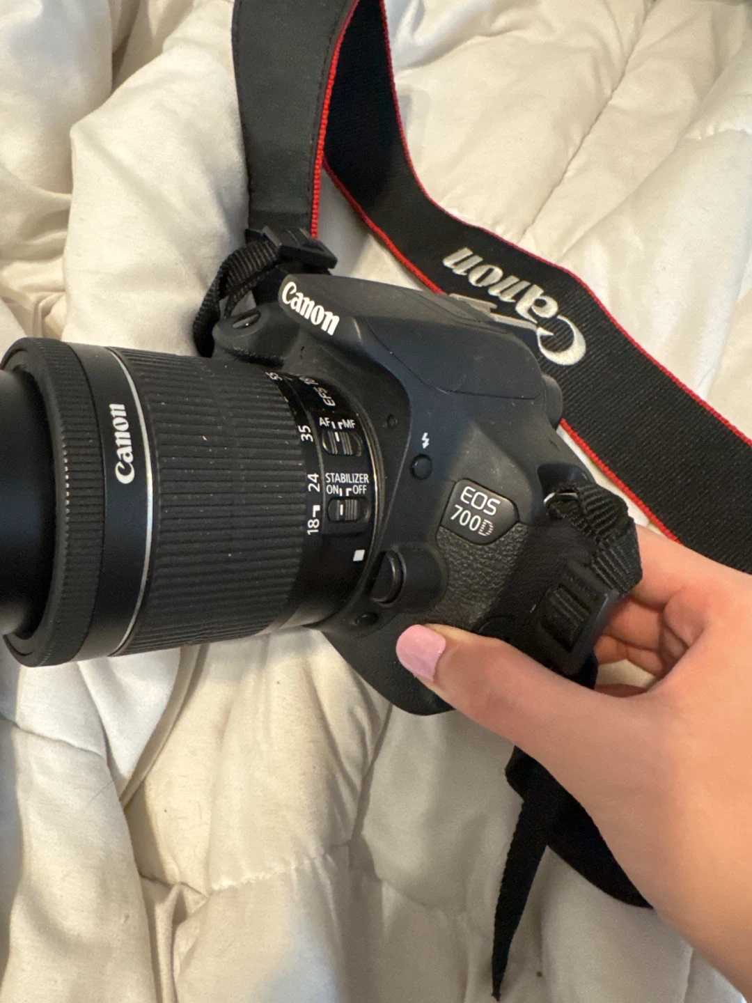 Canon EOS 700D DSLR camera with a Canon Zoom Lens EF-S 18-55mm 1:3.5-5.6 IS STM. Includes the original Canon camera strap. Great for capturing photos and videos!