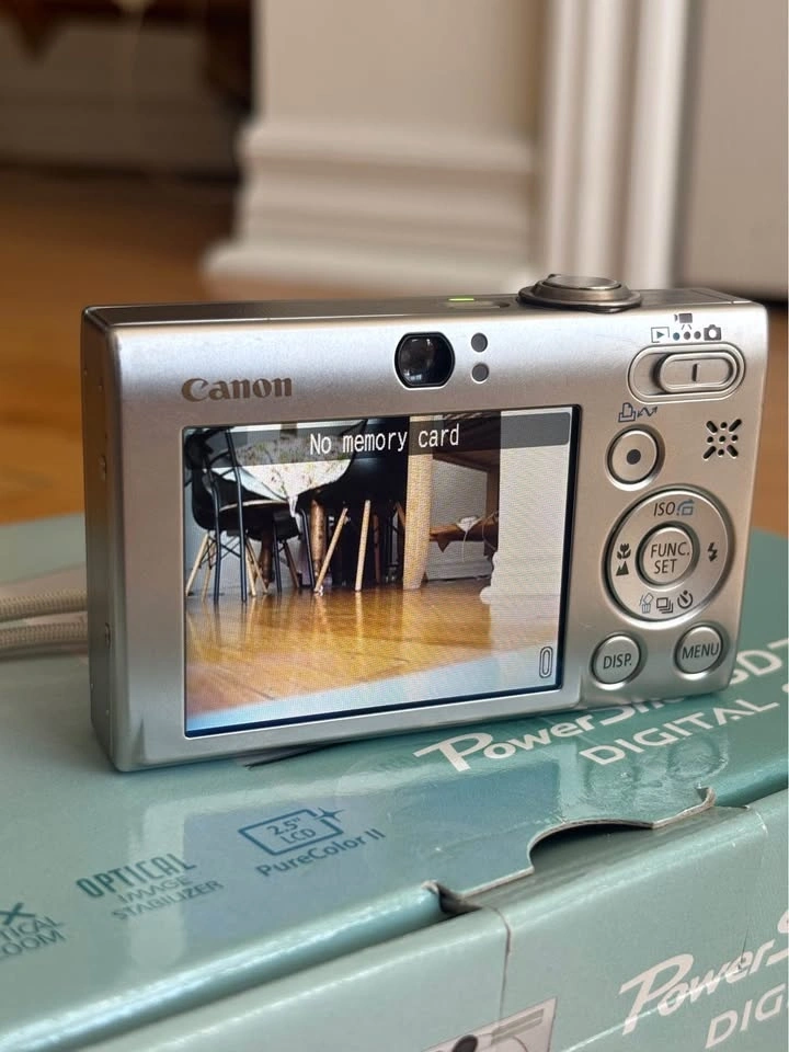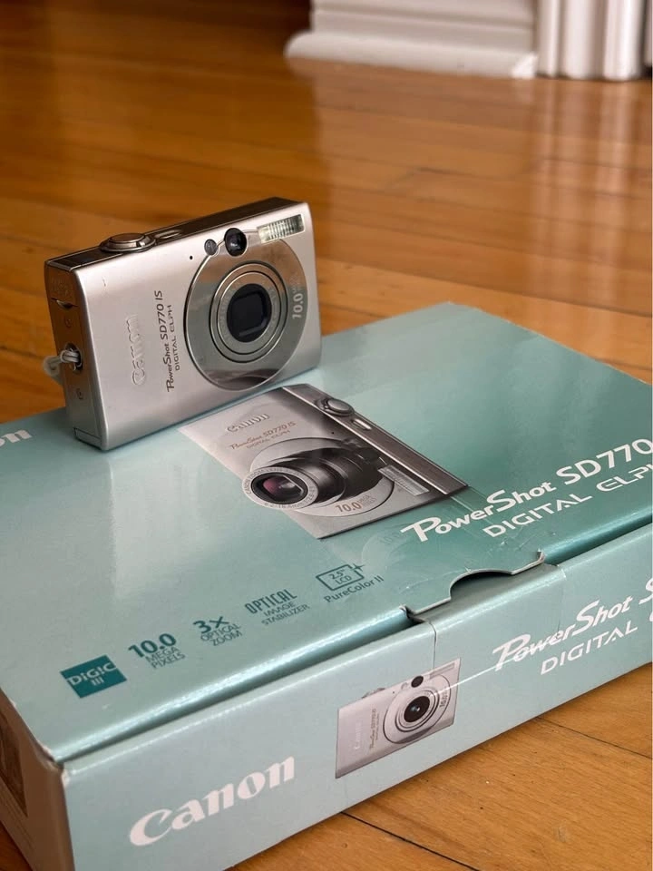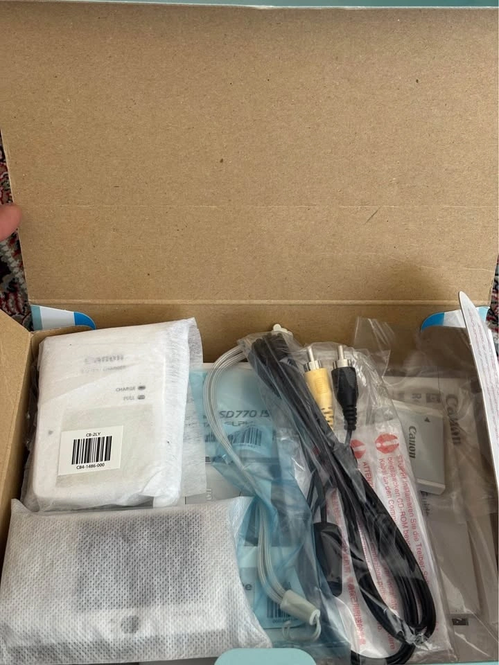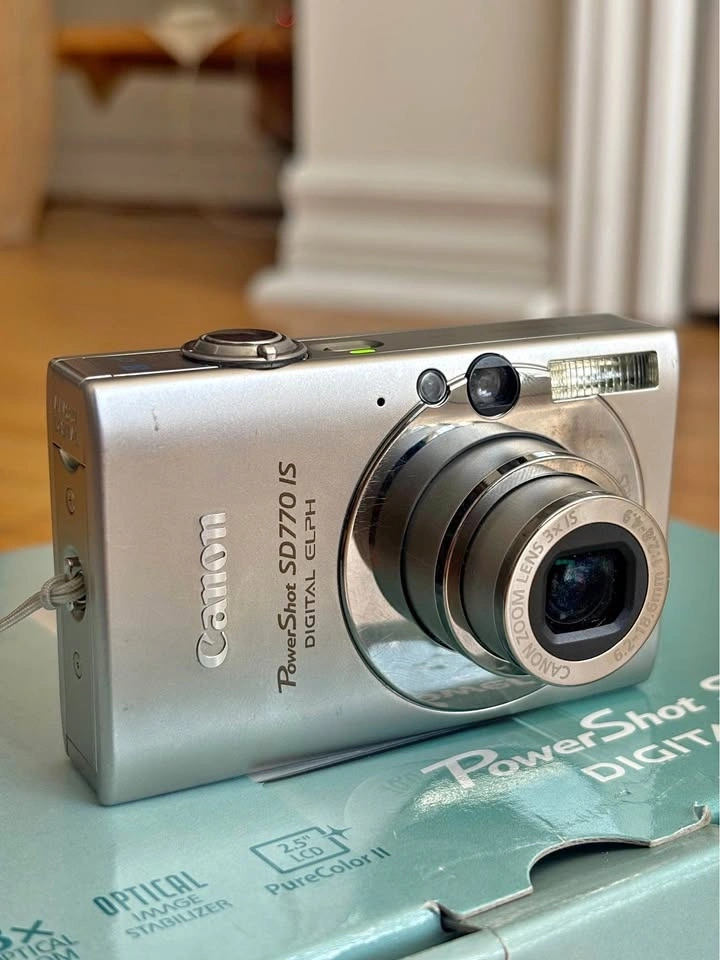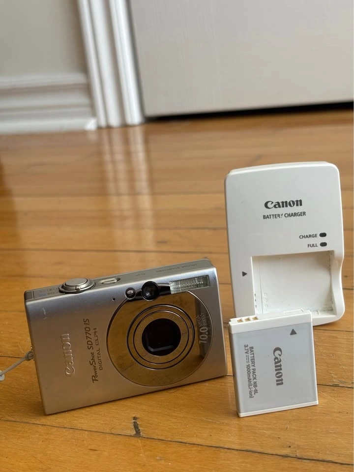 Silver Canon PowerShot SD770 IS Digital ELPH camera in top-notch condition. It also records videos. Comes with the original battery, battery charger, cables, and everything is in the original packaging in the box. A great condition camera for the price. The last picture is taken by the camera.