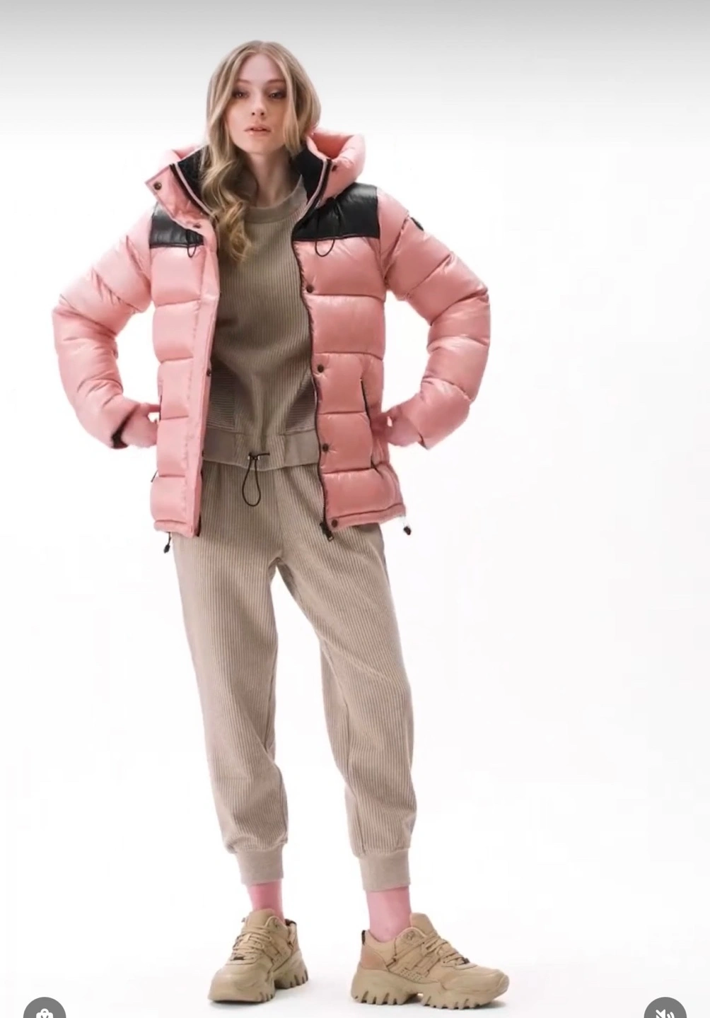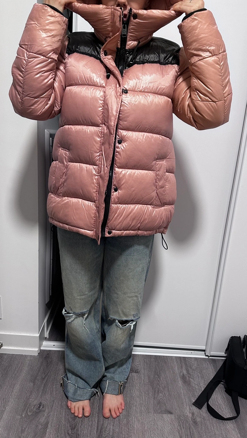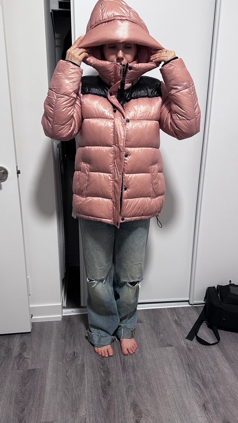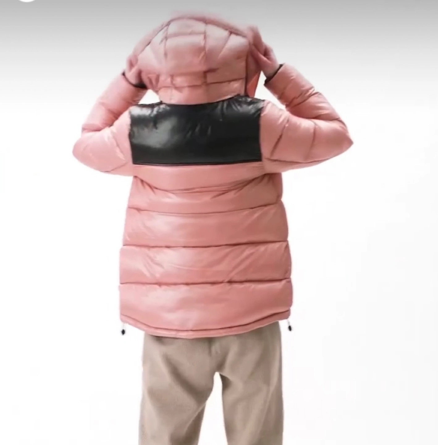 Pink puffer jacket with a hood, black accents, and zipper closure. Long sleeves with ribbed cuffs. Drawstring at waist. Brand tag says 'Duvet-Eco-Down'. Also can be for kids