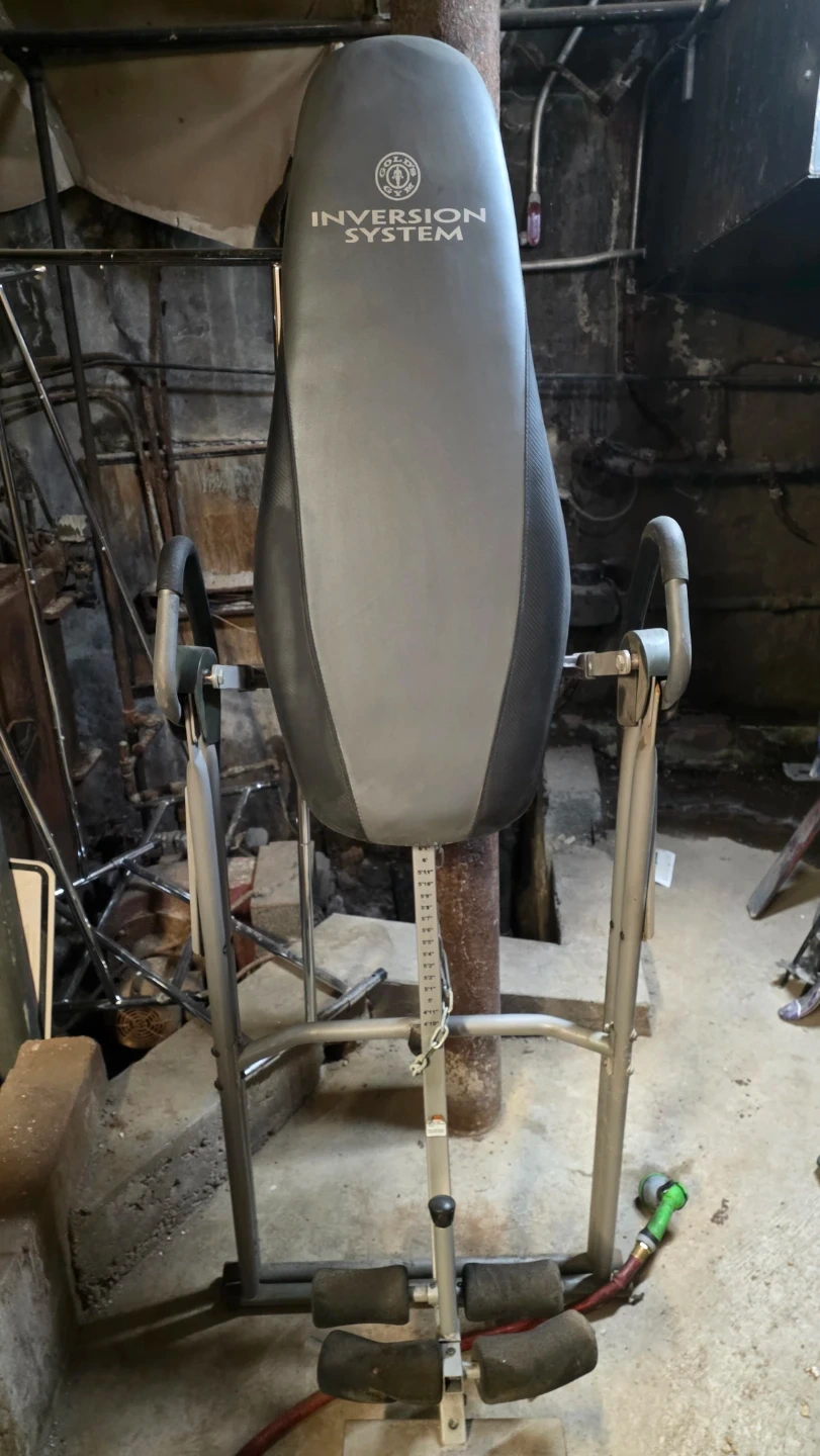 This is a Gold's Gym inversion system. It's designed for spinal decompression and relaxation. The unit features padded ankle supports and adjustable height settings for user comfort. It has a sturdy metal frame for stability.