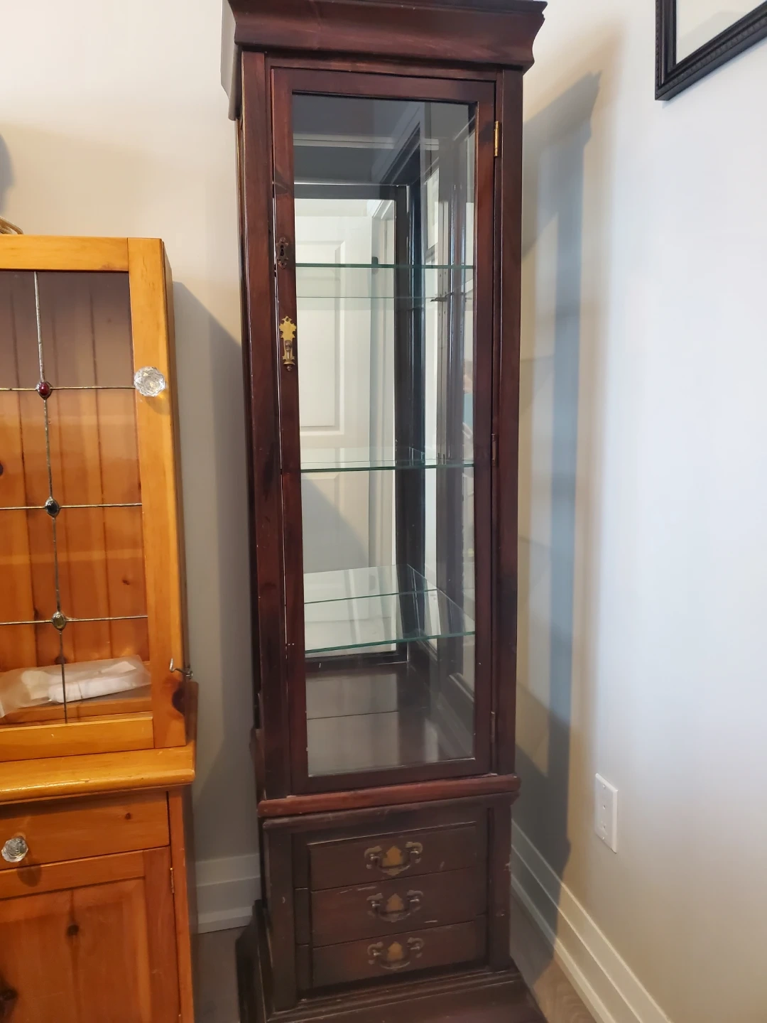 Selling a lovely wooden display cabinet! It features glass shelves and a drawer at the bottom for extra storage. It's perfect for showcasing your favourite items or collectibles in your home.