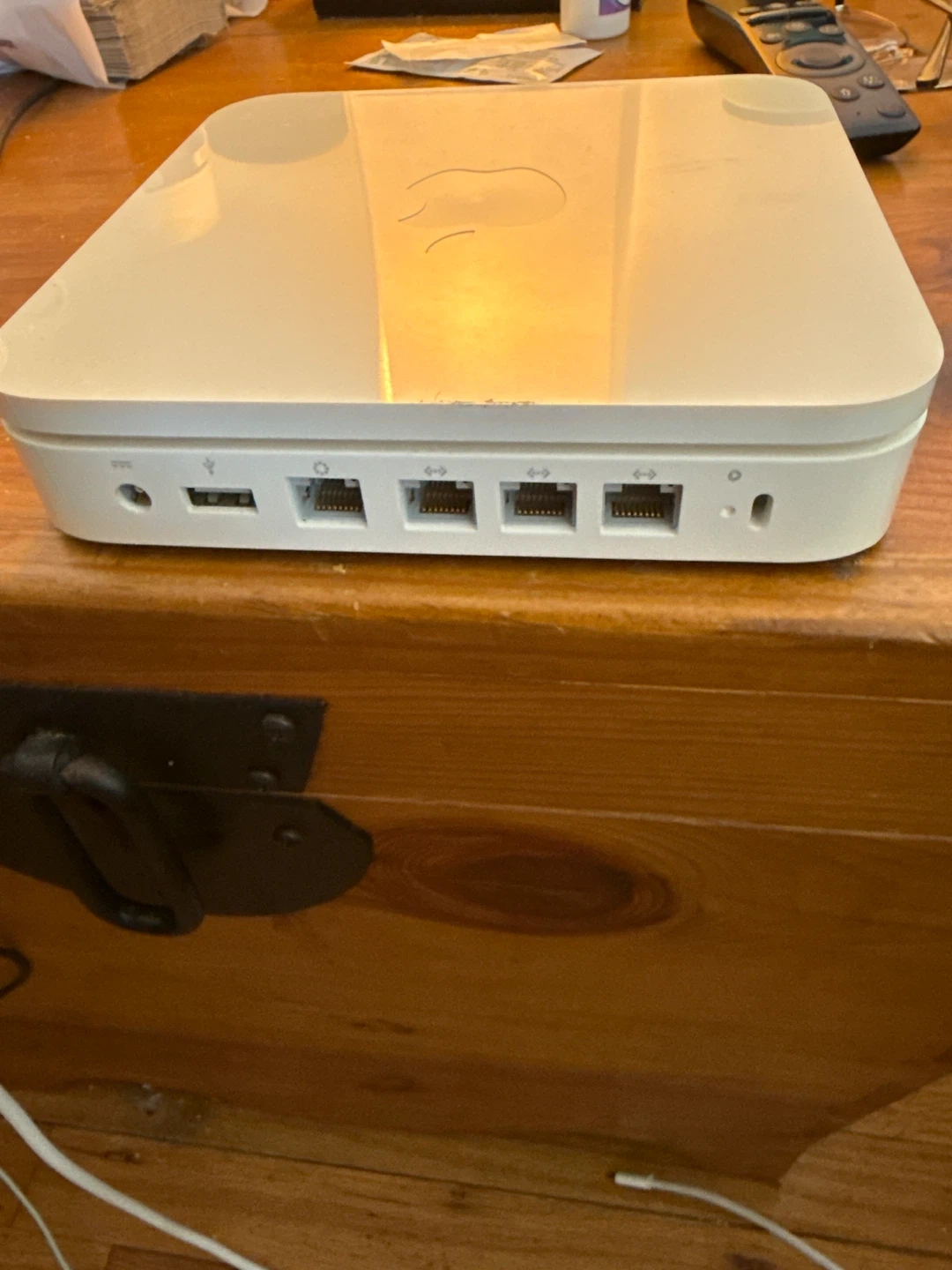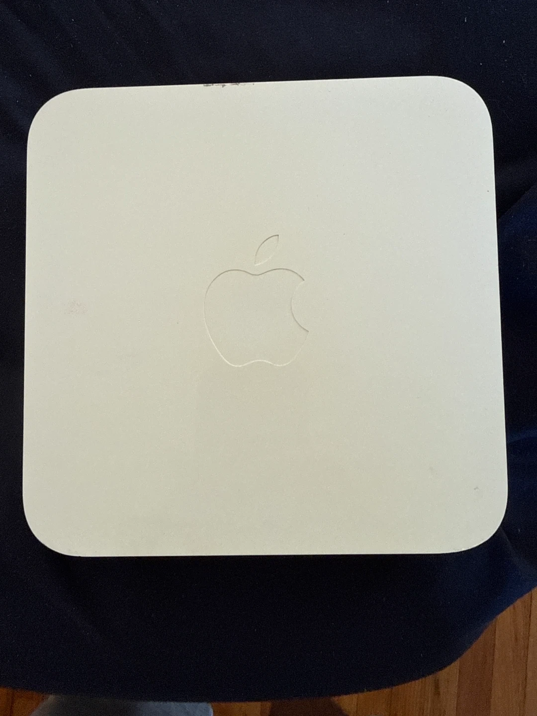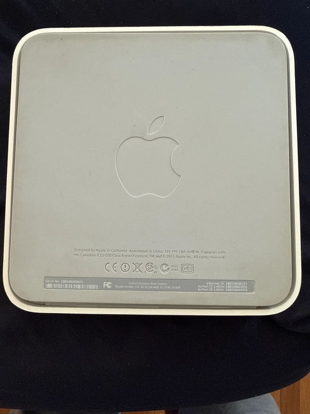 This is an Apple AirPort Extreme Base Station, model A1408. It's a wireless router that provides Wi-Fi connectivity. It includes multiple Ethernet ports for wired connections.