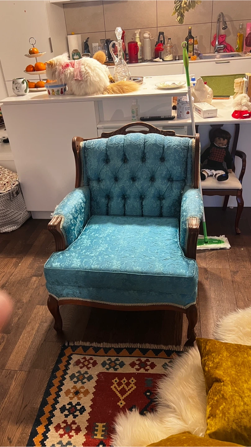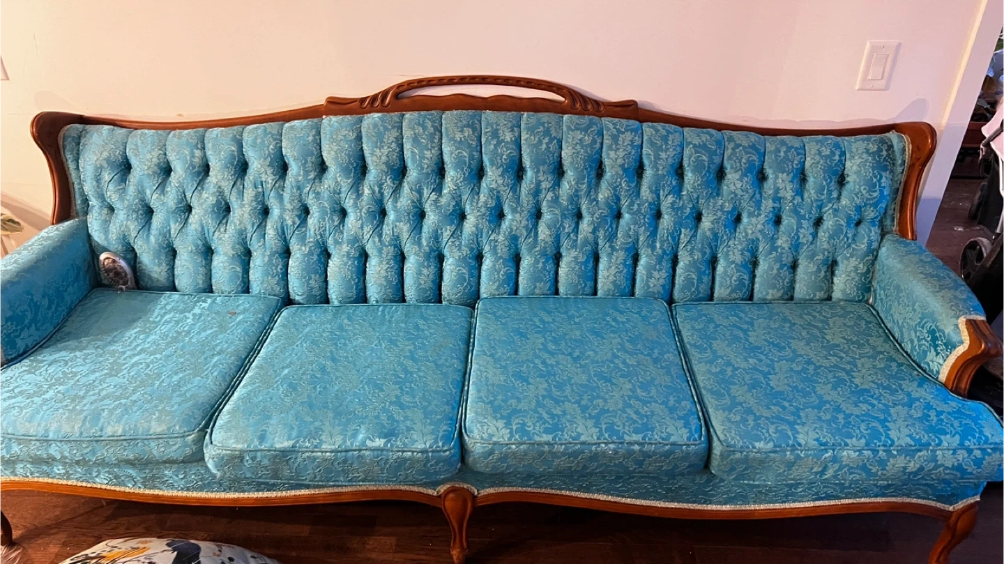 This is a beautiful vintage sofa with tufted detailing. It's upholstered in a striking blue damask fabric with a carved wooden frame. The sofa has four seat cushions.
