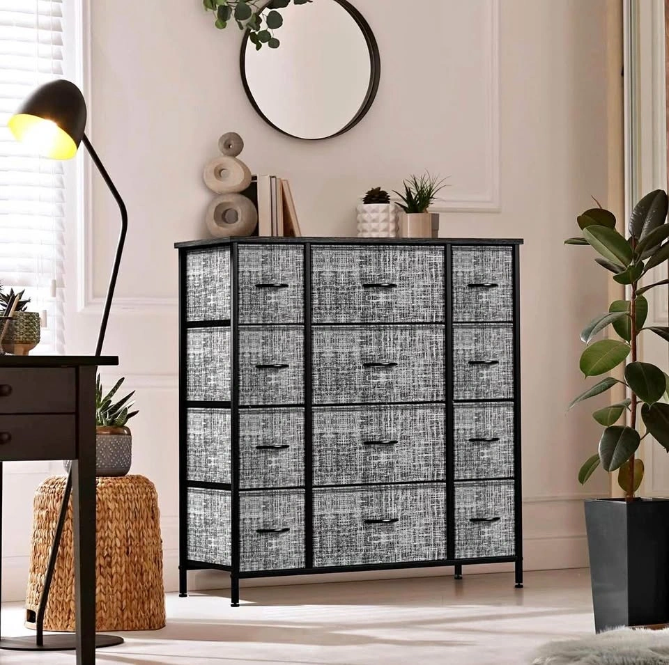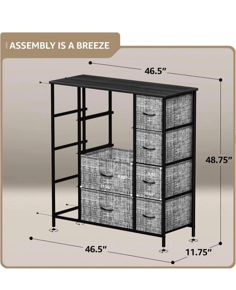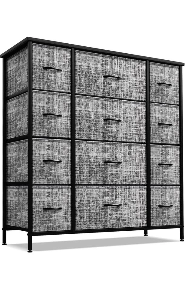 This assembled dresser has a sturdy steel frame and a wood top, providing a durable and stylish storage solution. The 12 easy-pull fabric bins are perfect for storing clothes, linens, and other household items.