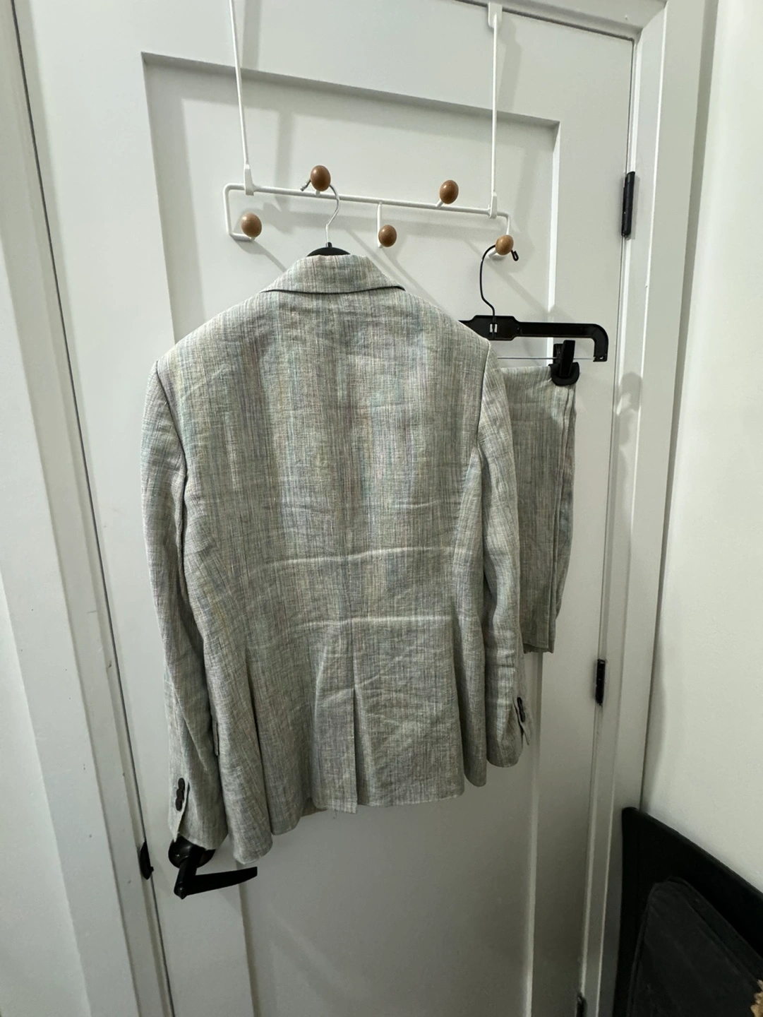 Gray linen suit, jacket and pants. Two button closure. Two front pockets, one chest pocket. Lined and worn only once.