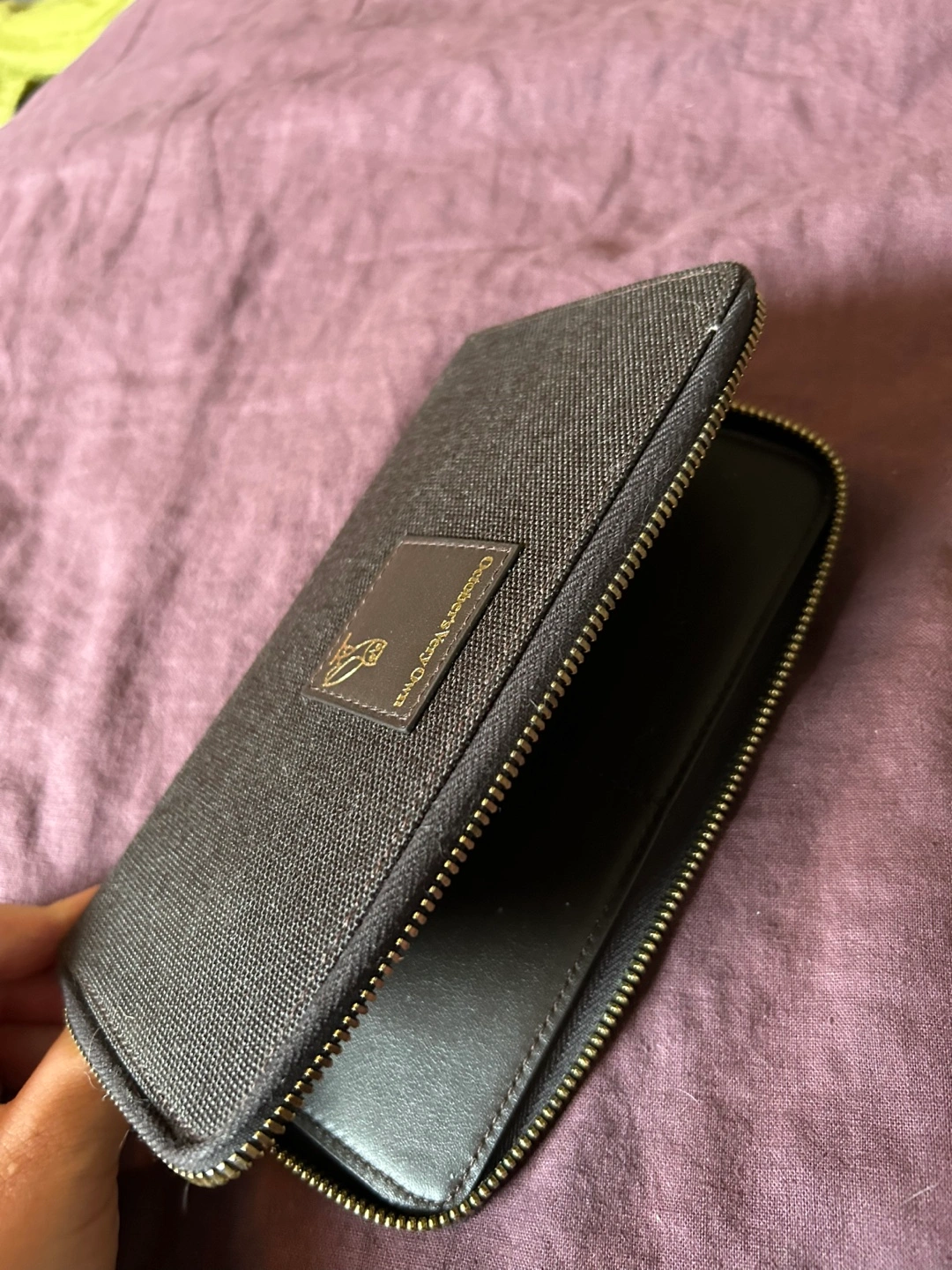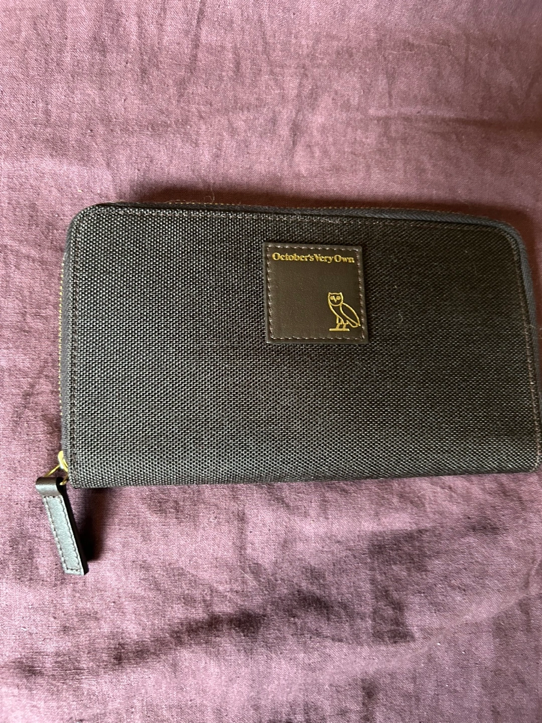 Brown zip-around wallet. Multiple card slots and compartments. Durable fabric exterior. Gold-toned zipper. OVO logo patch. Never used.