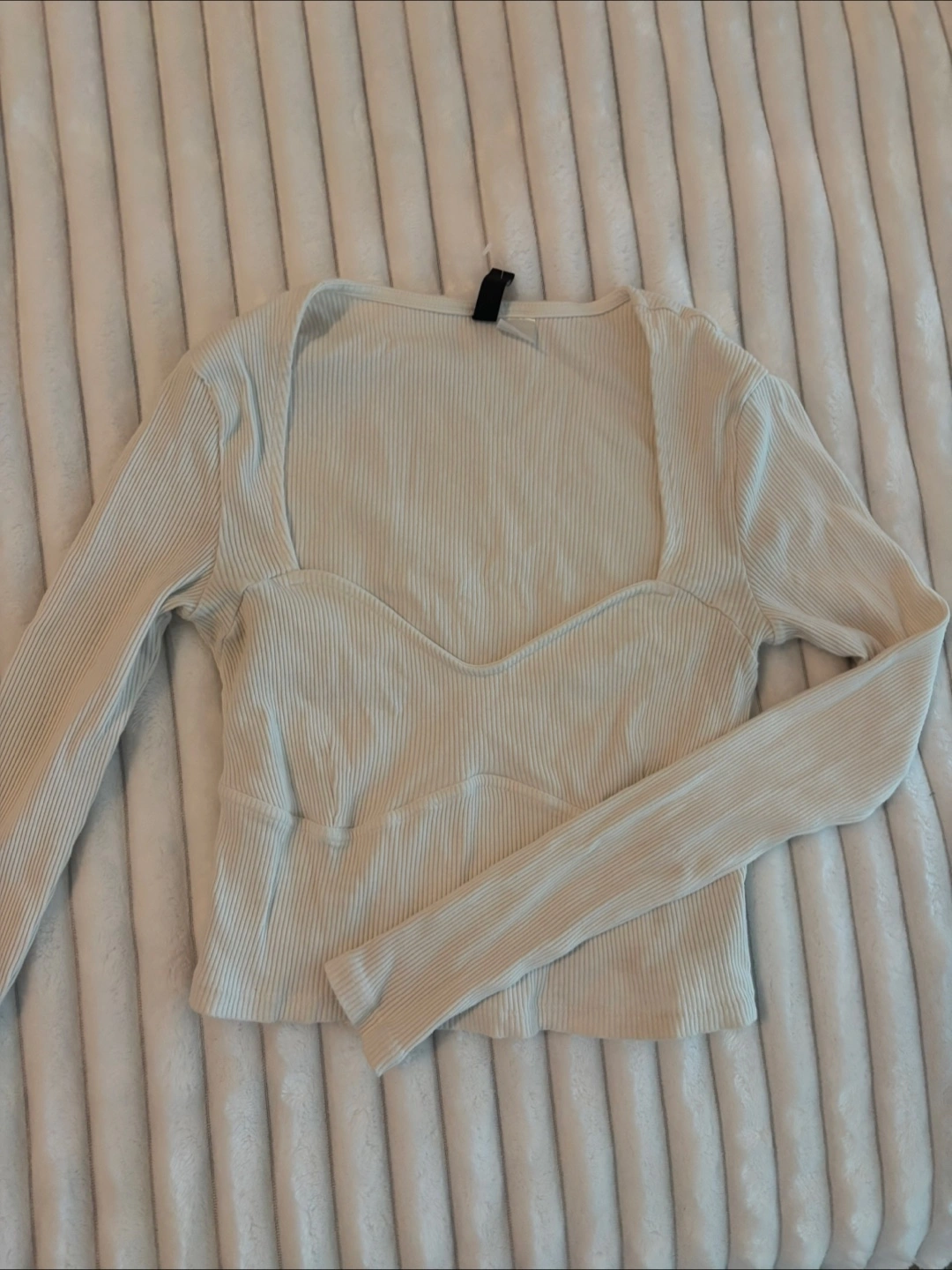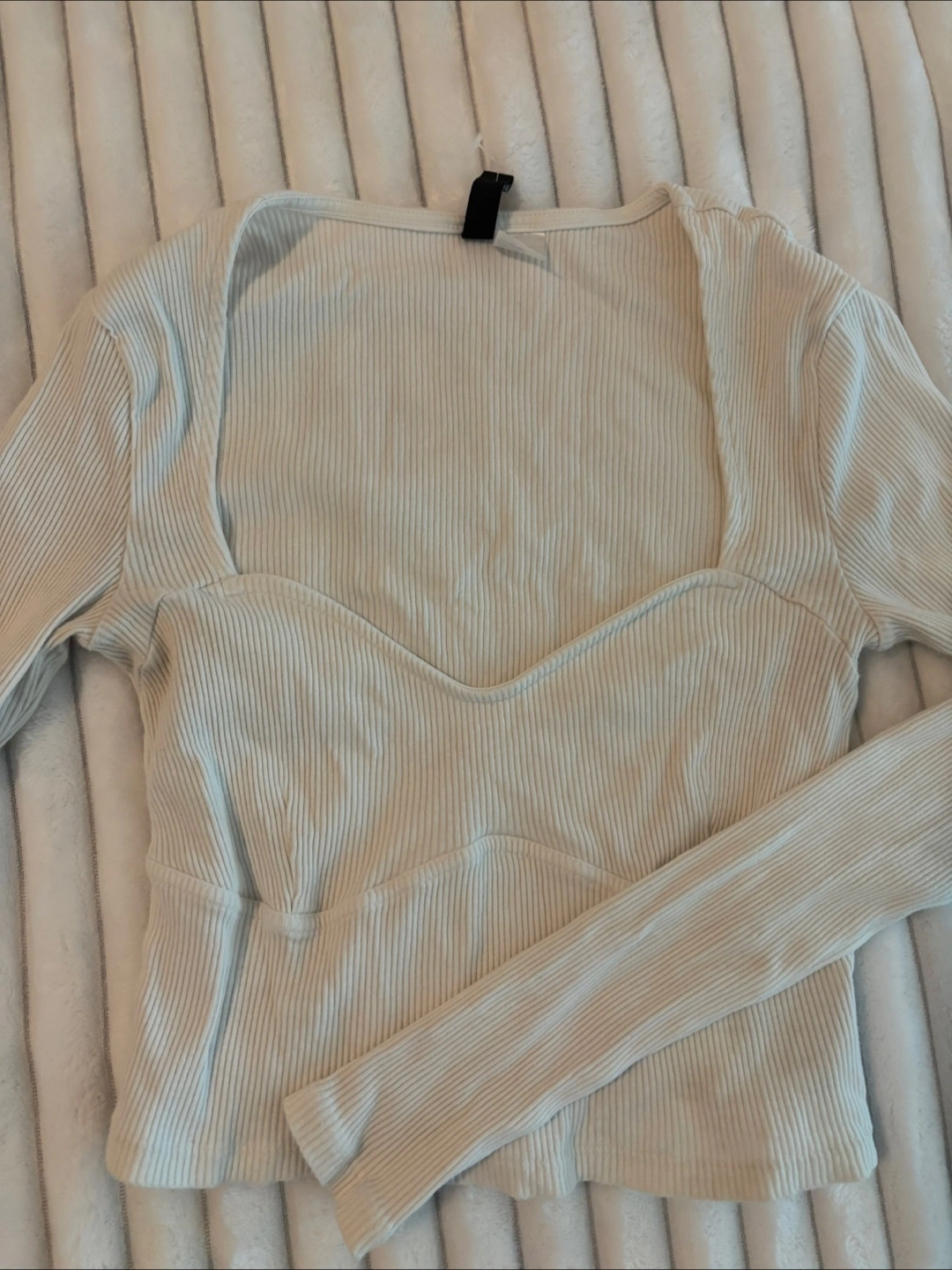 A lovely ribbed long sleeve top in a cream colour! It's in great condition and would be a wonderful addition to your wardrobe. The material is soft and comfortable, perfect for layering or wearing on its own. The square neckline adds a touch of elegance