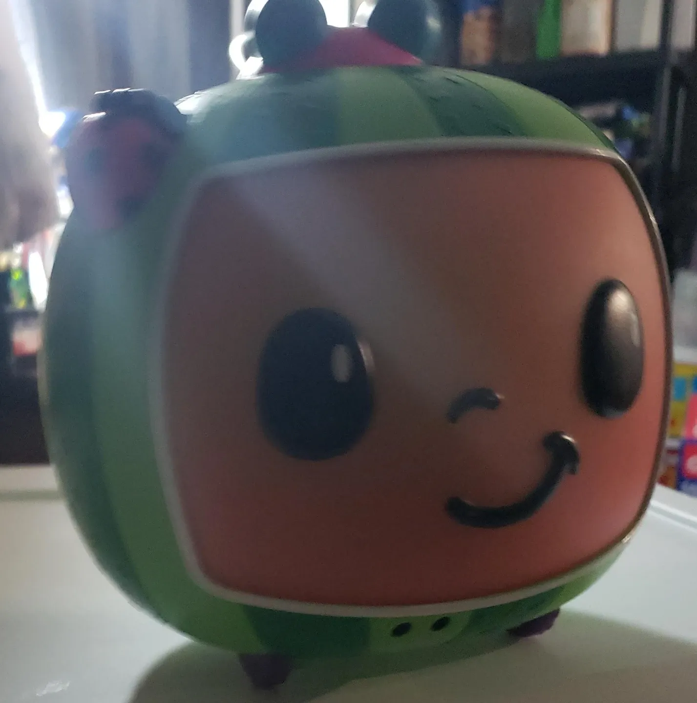 This CoComelon toy features a watermelon design with JJ's face. It's a fun musical learning toy for little ones. Made of durable plastic.