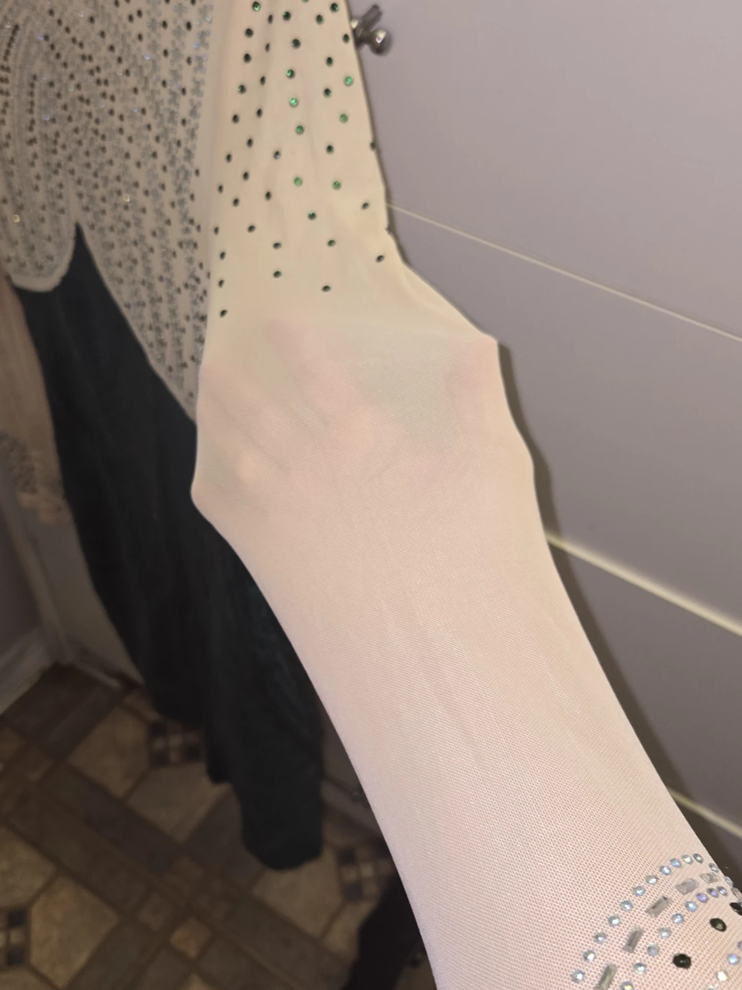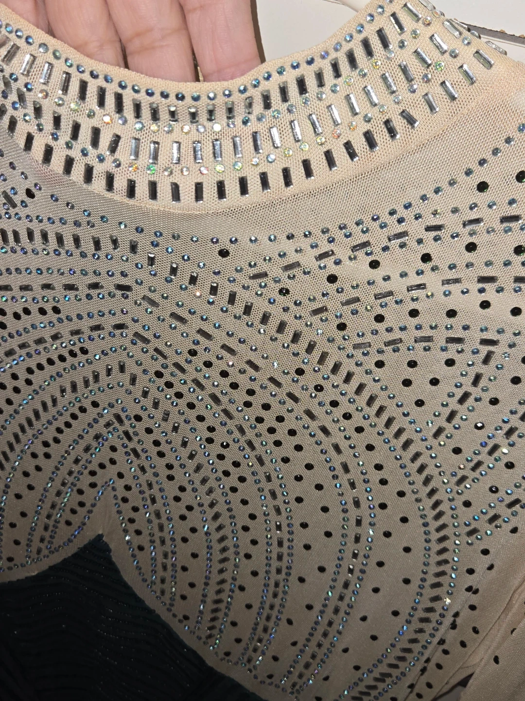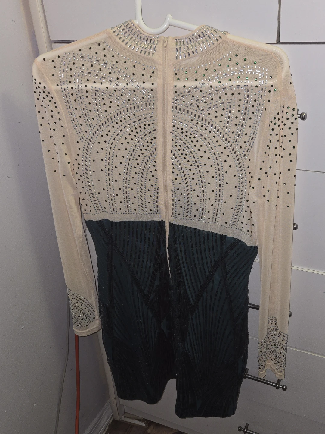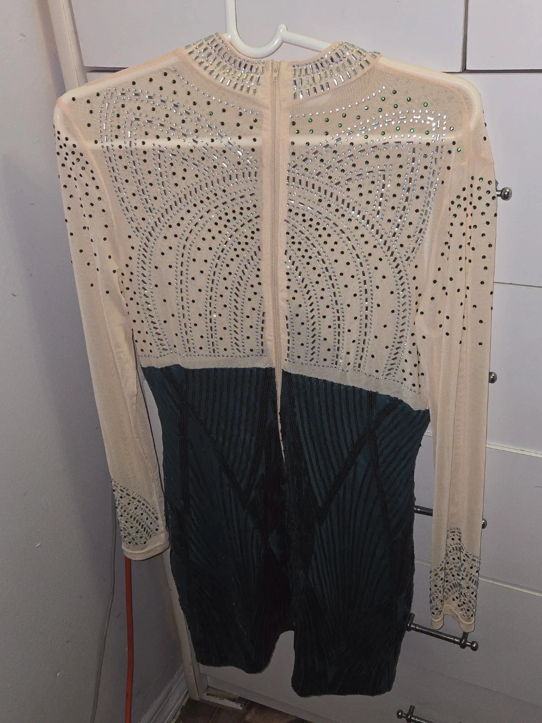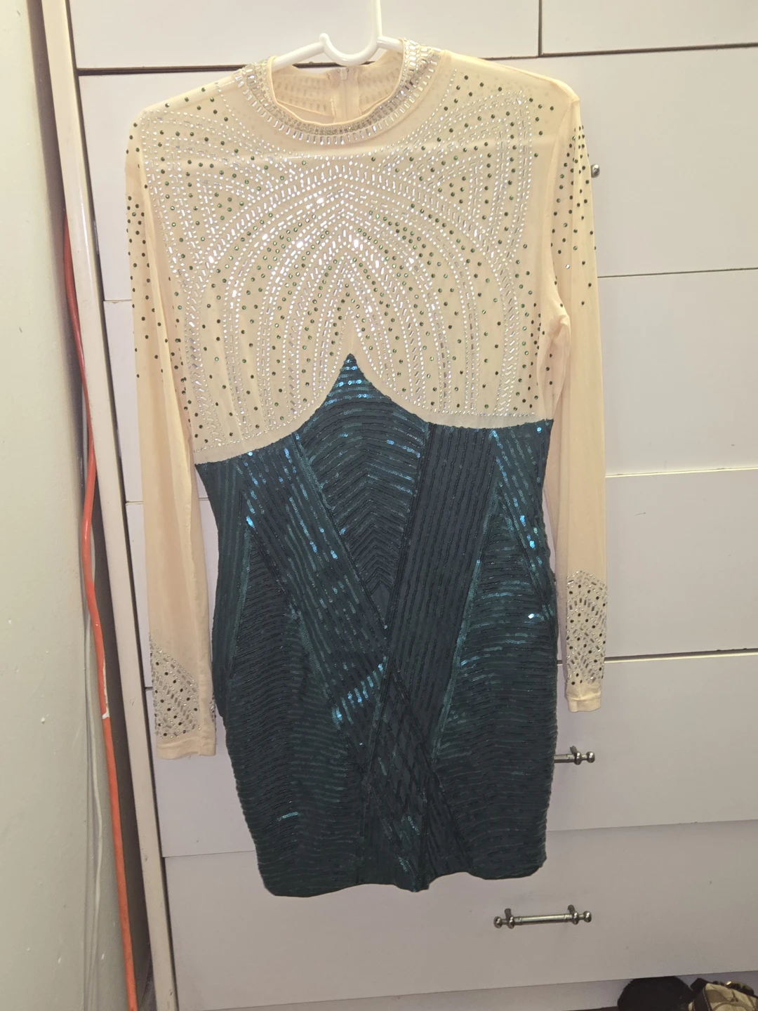 This long-sleeved dress features a sparkly mesh top with rhinestone embellishments and a contrasting sequined skirt. It has a high neckline and a back zipper closure. It's a showstopper for any special occasion!